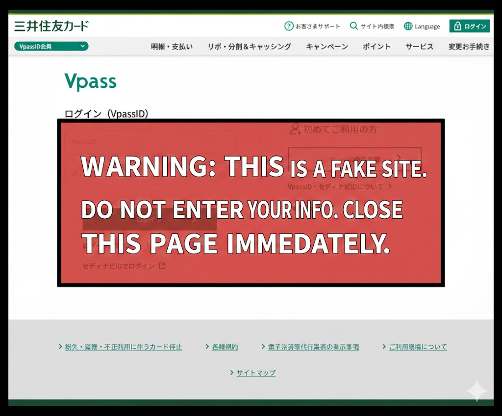 リンク先のURLは、ウイルスバスターやGoogle Safe Browsingによって「詐欺サイト」としてブロックされています。これは、過去に同様のドメインで偽ログイン画面が表示され、カード番号やパスワードを盗み取る挙動が確認されたため、非常に危険な状態であることを意味します。