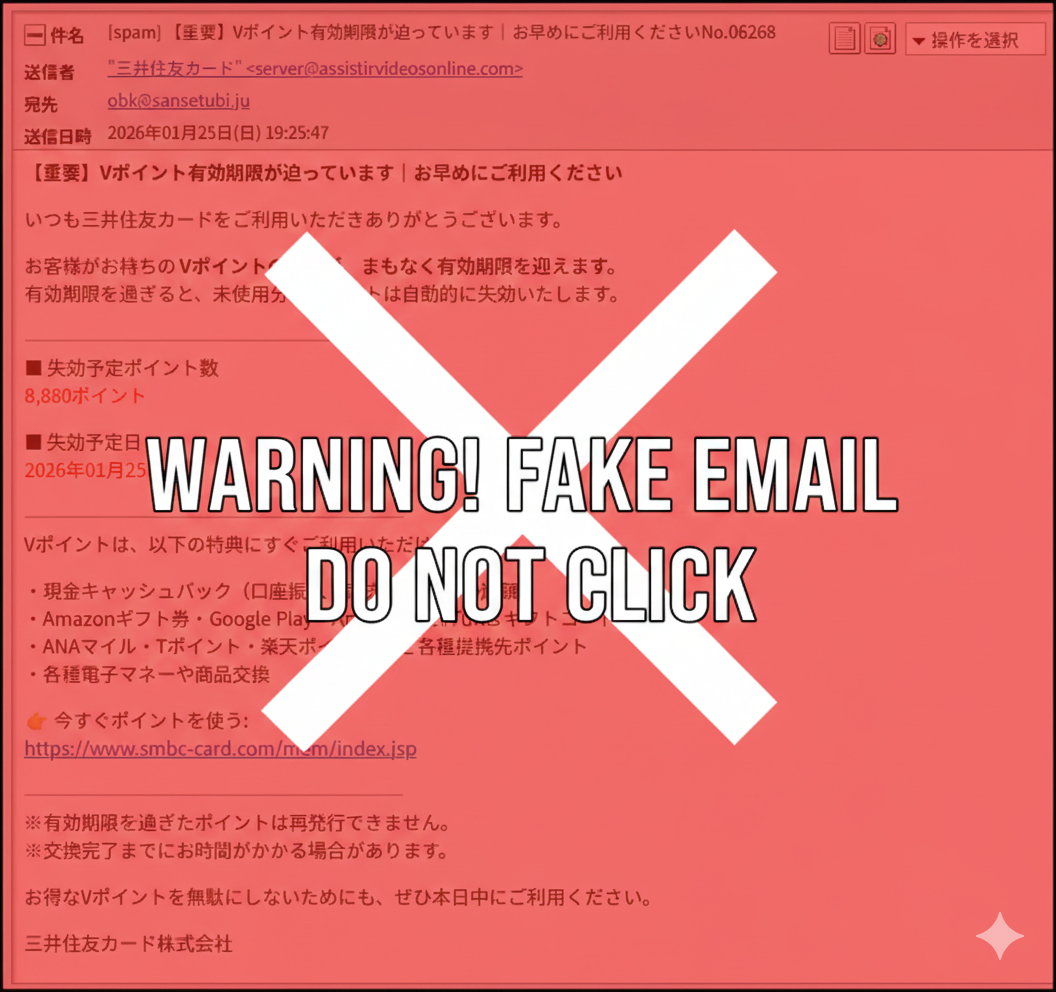 今回のメールは、「Vポイントの失効」というユーザーの心理的不安を突いた典型的なフィッシング詐欺でした。送信元アドレスの不一致、および無関係な米国ドメインへの誘導が決定的な証拠です。甘い誘い文句には裏がある、という教訓を改めて心に刻みましょう。 さらに、三井住友カードをかたるスパムメールや迷惑メールが増加しており、利用者の注意が必要です。これらのメールは、ユーザーをだまし、個人情報漏洩を狙ったなりすまし行為が含まれています。サイバーセキュリティ上のリスクを軽減するためには、常に怪しいリンクや不審な送信者に対して警戒心を持ち、適切な解析を行うことが重要です。注意喚起を怠らず、自己防衛を心がけましょう。