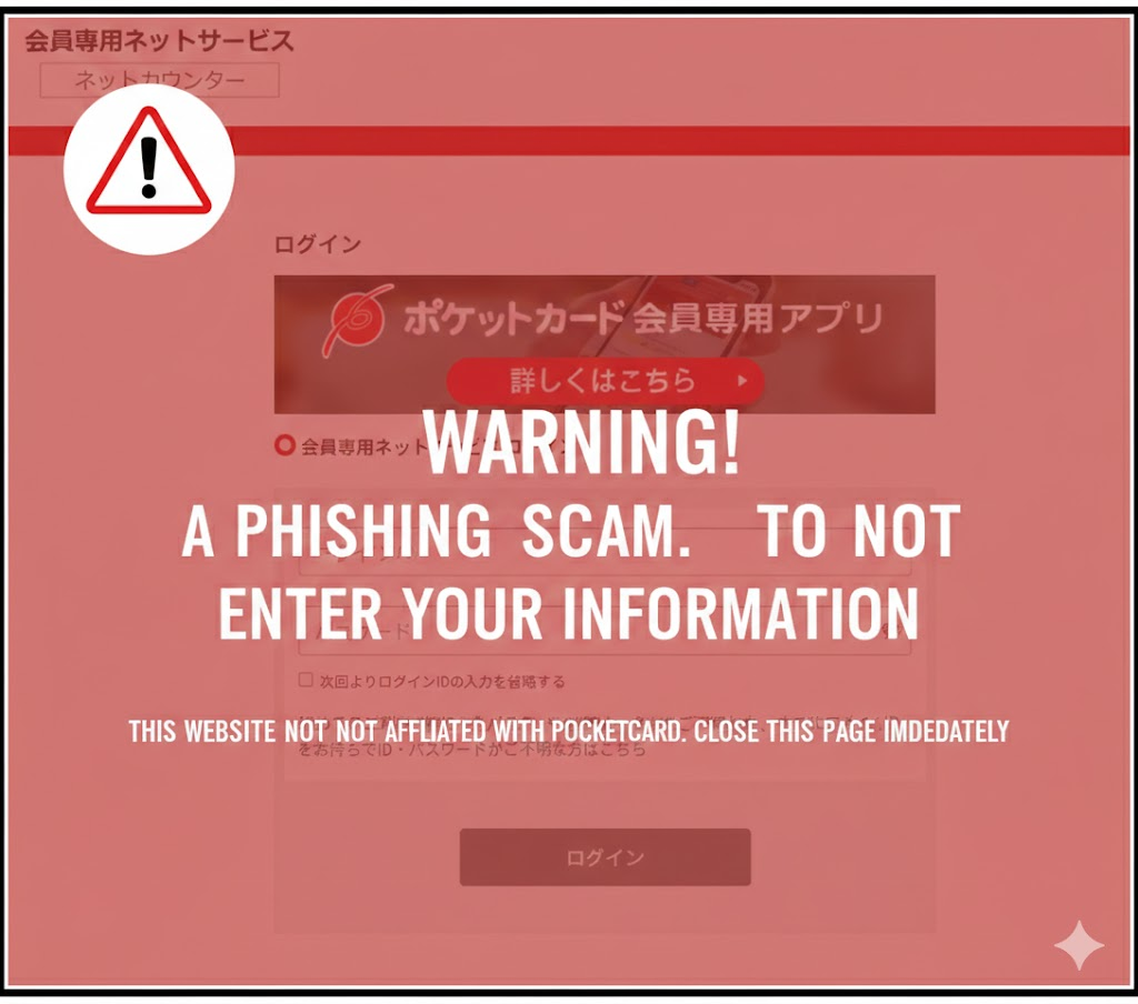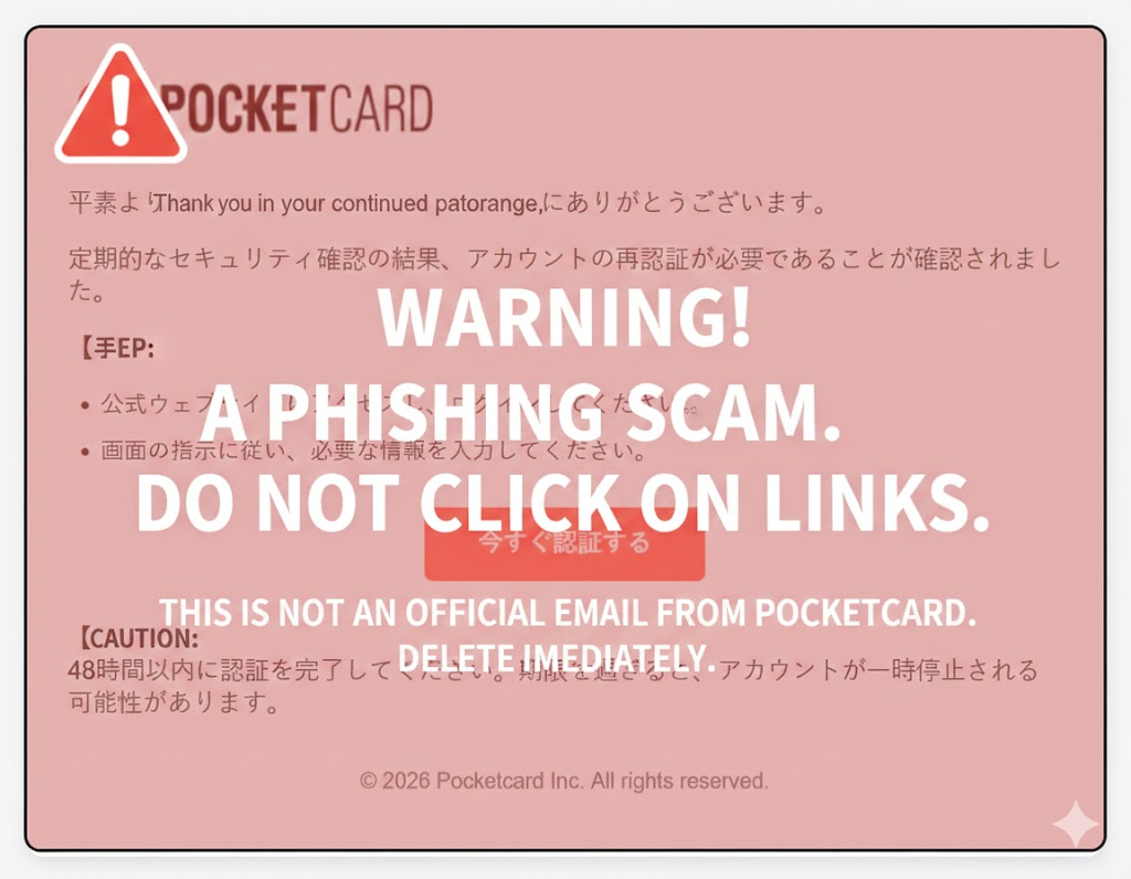 このメールは「ポケットカード」を装ったフィッシング詐欺です。