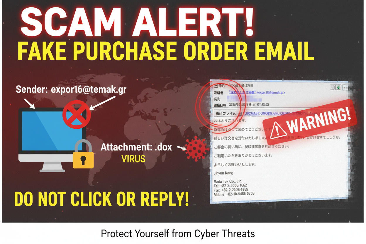 2026年に入り、AIを用いたより自然なビジネスメールの偽装が急増しています。特に「注文書(Purchase Order)」や「見積依頼」を装い、ウイルスを仕込んだOffice文書やPDFファイルを送りつける手口は、B2B(企業間取引)を狙った攻撃の定番となっています。