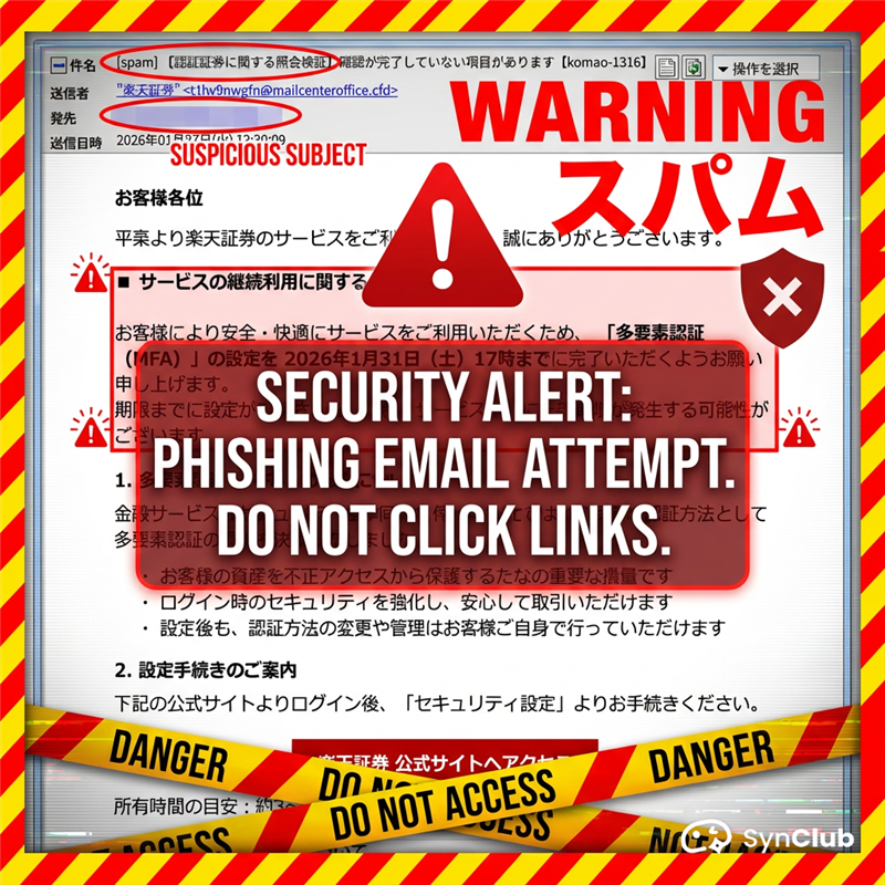 今週は、楽天証券や主要銀行を騙り、「設定期限」を数日以内に設定してユーザーを焦らせる手口が多く確認されています。また、メールの末尾に全く無関係な企業(今回はMonex)のコピーライトを記載するなど、テンプレートの作成ミスが散見されるのも特徴です。