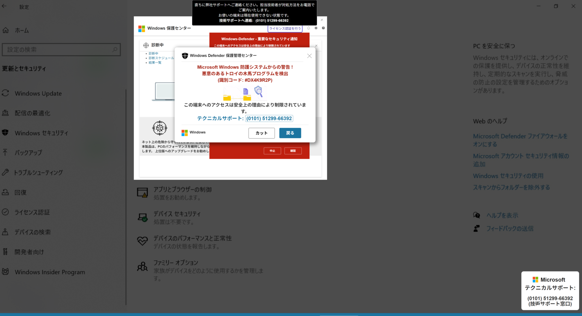 Windowsの「設定」画面を模倣し、中央に「Windows Defender 保護管理センター」という偽のポップアップを表示しています。赤文字で「トロイの木馬プログラムを検出」と恐怖を煽り、(0101) 51299-66392 というテクニカルサポートへの架電を要求しています。背景がぼかされているのは、ユーザーの焦りを誘い、ポップアップに集中させるための巧妙な心理的トリックです。