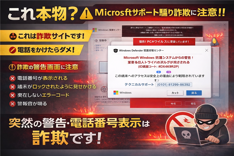 最近のスパムはメール単体で完結せず、リンク先でブラウザを全画面表示にしてフリーズさせる「サポート詐欺(テクニカルサポート詐欺)」へ誘導するケースが激増しています。ユーザーをパニックに陥れ、偽の電話番号へダイヤルさせるのが彼らの常套手段です。