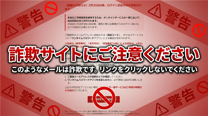 今週は、2026年からの「新認証システム導入」を口実にしたフィッシングが急増。特に週末の早朝など、ユーザーの判断力が鈍る時間帯を狙った配信が確認されています。