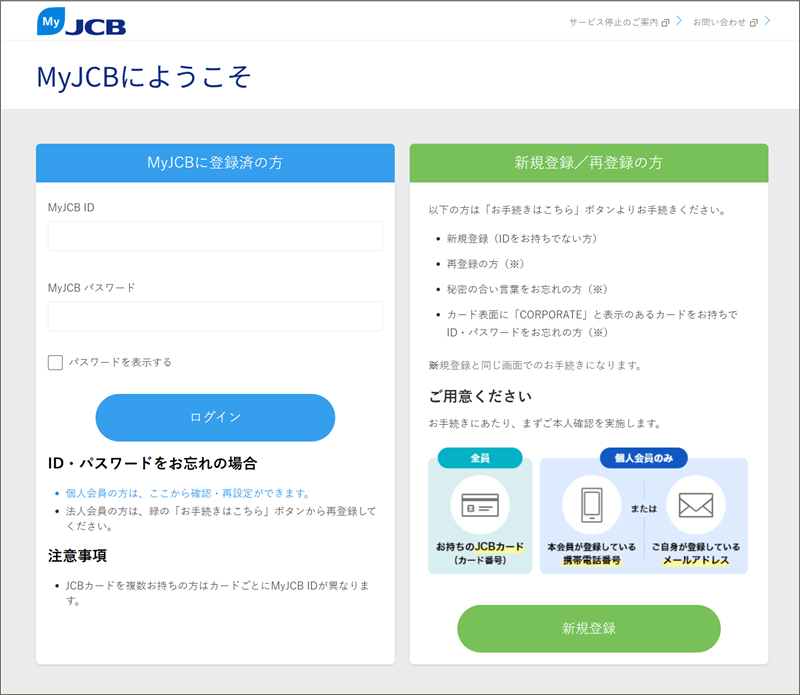 「MyJCBで確認する」のリンク先: