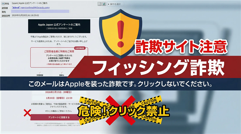 今回の「Apple公式アンケート」を装ったメールは、特典を餌にユーザーを釣る古典的なフィッシング詐欺でした。