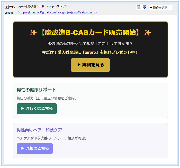 今週は、「B-CASカードの改造」という、それ自体が法に触れる内容を堂々と掲げたメールが多数観測されています。受信者の「得をしたい」という心理と、後ろめたさを利用した悪質な内容です。