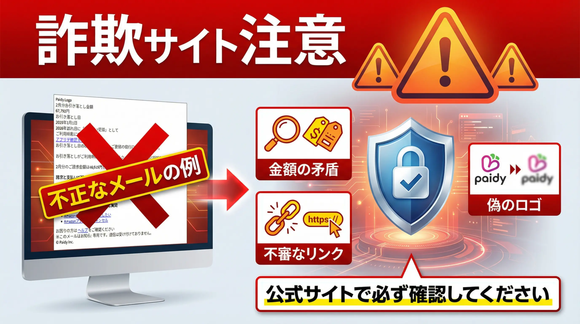 2026年に入り、Paidy(ペイディ)を騙るフィッシングメールの精度が上がっています。特に「2月1日」という決済確定日をピンポイントで狙い、高額な請求金額を提示してパニックを誘う手法が定着しています。