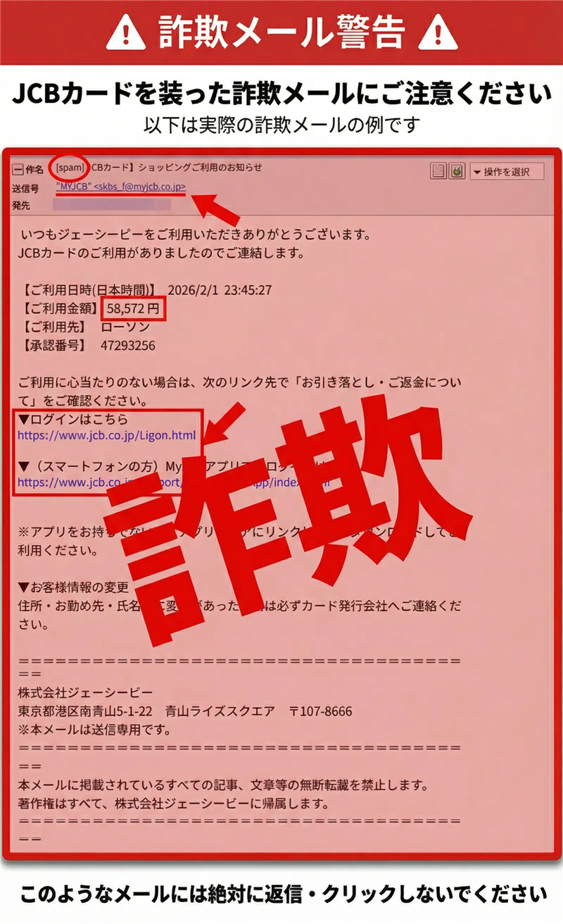 【調査報告】最新の詐欺メール解析レポート 発行日:2026年02月03日 / セキュリティ解析結果:メール内容の解析 | ■ 最近のスパム配信動向について 今回ご紹介するのは「JCBカード」を騙るフィッシングメールですが、その前に最近のスパムの動向を確認しておきましょう。現在、攻撃者は「不審なログイン」という警告だけでなく、「具体的な店舗での利用明細」を偽装して送りつける手法にシフトしています。実在の店舗名(ローソン等)を出すことで、受信者に「身に覚えがない=不正利用された」という強い不安を抱かせ、冷静な判断を失わせるのが狙いです。 | ▼ はじめに 本レポートでは、巧妙にJCBを装った詐欺メールを解析し、その送信経路や誘導先サイトの異常な挙動を詳しく解説します。 | | 件名 | [spam] JCBカード】ショッピングご利用のお知らせ | | 件名の見出し | 件名に[spam]という文字列が含まれているのは、受信サーバーがこのメールの送信ドメイン(SPF/DKIM)が正規のJCBのものではないと判断し、迷惑メールの警告タグを自動挿入したためです。 | | 送信者 | “MYJCB” <skbs_f@myjcb.co.jp> | | 受信日時 | 2026-02-03 15:28 | ▼ メール本文の再現(※リンクはすべて無効化・一部伏字) 画像がうまく表示されない場合は、 こちら よりご確認ください。 ————————————————– MyJCB Spot Mail ————————————————– いつもJCBカードをご利用いただきありがとうございます。 いつもジェーシービーをご利用いただきありがとうございます。 JCBカードのご利用がありましたのでご連絡します。 【ご利用日時(日本時間)】 2026/2/1 23:45:27 【ご利用金額】 58,572 円 【ご利用先】 ローソン 【承認番号】 47293256 ご利用に心当たりのない場合は、次のリンク先で「お引き落とし・ご返金について」をご確認ください。 ▼ログインはこちら https://www.jcb.co.jp/Ligon.h*** ▼(スマートフォンの方)MyJCBアプリでのログインはこちら https://www.jcb.co.jp/support/pop/myjcb/App/index.h*** ※アプリをお持ちでない方はアプリストアにリンクします。ダウンロードしてご利用ください。 ▼お客様情報の変更 住所・お勤め先・氏名等に変更があった場合は必ずカード発行会社へご連絡ください。 ================================================== 株式会社ジェーシービー 東京都港区南青山5-1-22 青山ライズスクエア 〒107-8686 ※本メールは送信専用です。 ================================================== 本メールに掲載されているすべての記事、文章等の無断転載を禁止します。 著作権はすべて、株式会社ジェーシービーに帰属します。 ================================================== | ▼ 専門的な解析レポート 【メールの感想】 本メールは「MyJCB Spot Mail」という実在の通知形式を模倣しており、非常に高い精度で作成されています。特に「ローソンで58,572円」という、ありそうで絶妙に高額な金額設定は、受信者の焦りを誘う計算された構成です。 【デザインの特徴】 公式サイトと同じフッター(住所や著作権表示)を使用しており、スマホ画面では正規メールと見分けがつきません。しかし、本文内のURLの綴りが一部異なっている(Ligon等)など、細部に不自然な点が見られます。 【危険なポイント】 最大の問題は「送信者アドレス」です。表示上は myjcb.co.jp となっていますが、後述する通信ログ(Received)を解析すると、海外の無関係なサーバーから送信されていることが一目瞭然です。本物のJCBメールであれば、送信元のドメインも必ず正規のものになります。 | ■ メール回線関連情報(Received解析) これは送信に利用した情報であり、以下のカッコ内のIPアドレスは信頼できる送信者情報です。 | Received情報 | from infoo1.keyenergyservice.com (unknown [204.194.51.17]) | | 送信元ドメイン | keyenergyservice.com | | 送信元IPアドレス | 204.194.51.17 | | ホスティング/サーバー | Key Energy Services (米国サーバー) | | ドメイン登録日 | 送信元ドメインはJCBとは一切無関係な法人のものであり、踏み台にされているか偽装されています。 | ≫ https://ip-sc.net/ja/r/204.194.51.17(送信元IP解析ページ) | ■ リンク先ドメイン・サイト解析レポート | リンク箇所 | 本文中のログインボタンおよび各URLテキスト部分 | | リンク先URL | https://loginj.accassistive[.]cfd/v8/html/… (※一部伏字を含みます) | | ブロック有無 | ウイルスバスターでブロックを確認済み | | サイトの状態 | 稼働中。警告を解除して進むと、「ウイルスバスターでブロック確認中… 少々お待ちください。」という文言と共にインジケーターが永遠にクルクル回り続ける特殊なページが表示されます。これはユーザーを待機させ、その間に裏で不正な処理を行うための典型的な詐欺の手口です。 | | ■ サイト回線関連情報(誘導先ドメイン) | リンクドメイン | loginj.accassistive.cfd | | IPアドレス | 172.67.147.164 | | ホスティング/国 | Cloudflare / United States | | ドメイン登録日 | 最近取得(極めて新しいドメイン) このドメインは最近登録されたばかりです。詐欺グループがブロックを逃れるために、取得