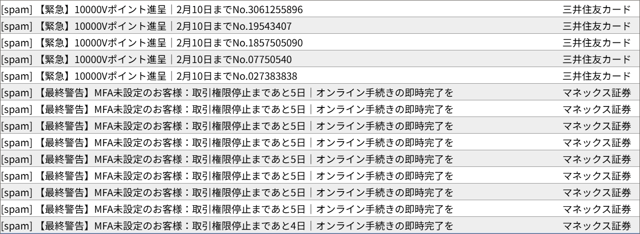 昨夜から今朝にかけて、特定の金融機関やサービスを狙った「波状攻撃」とも言える大量の詐欺メールが確認されました。その手口は非常に執拗で、機械的に送りつけられている実態が浮き彫りになっています。