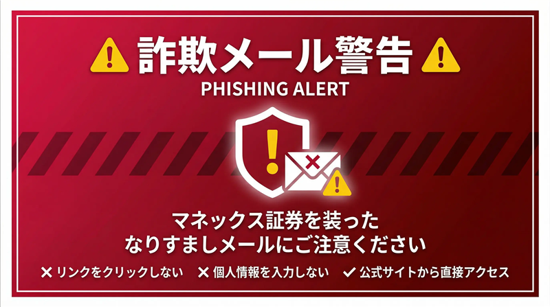 絶対にリンクをクリックしないでください。マネックス証券の公式サイトでも、このような緊急を煽るメールへの注意喚起が出ています。