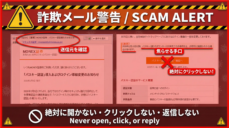 • 公式の注意喚起:マネックス証券は、案内メールにログインを促すURLを記載しないと公表しています。リンクがある時点で詐欺確定です。
