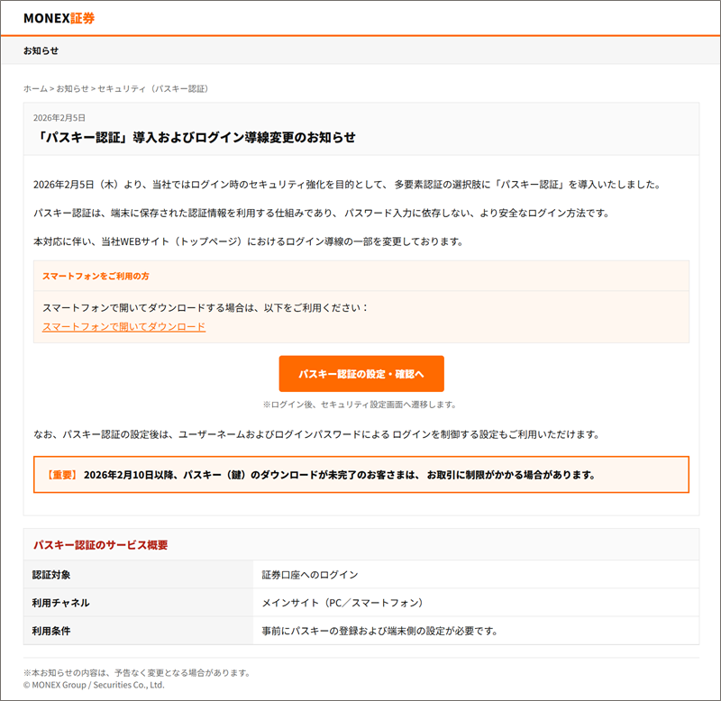 2026年2月10日以降、パスキー(鍵)のダウンロードが未完了のお客さまは、お取引に制限がかかる場合があります。