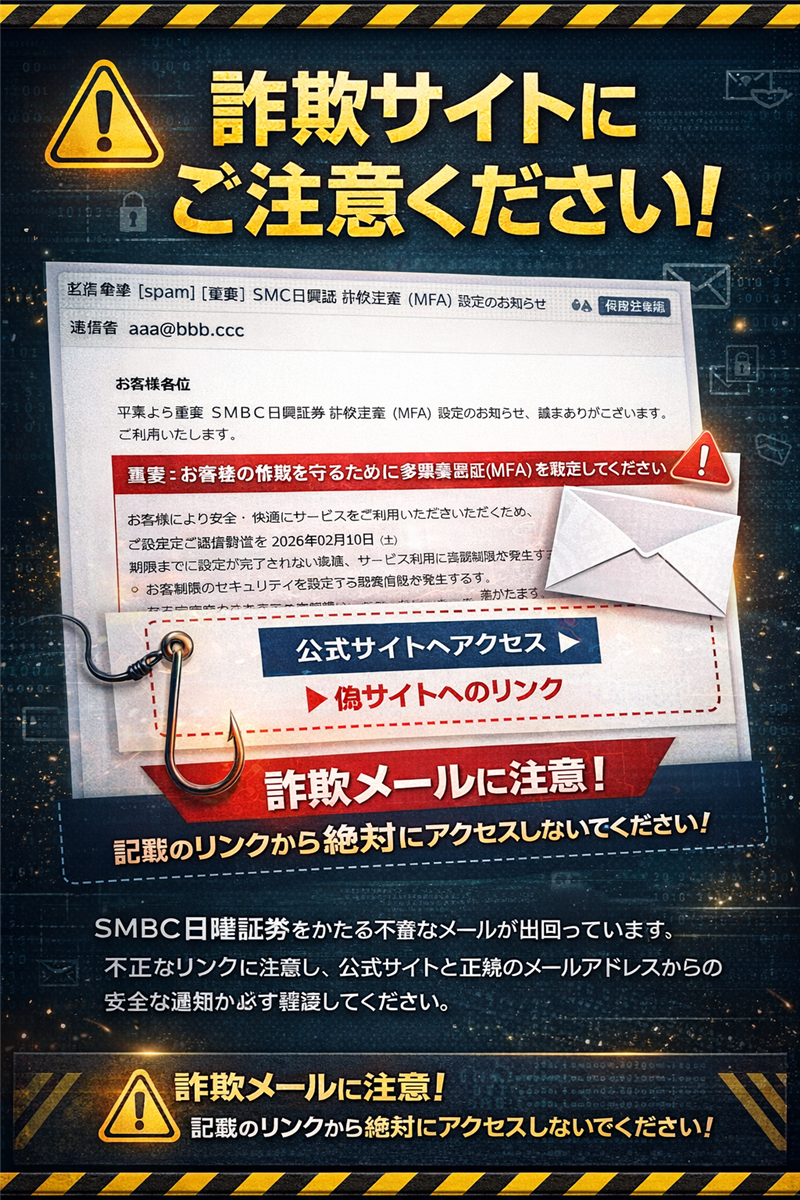 今回ご紹介するのは「SMBC日興証券」を騙るメールですが、その前に最近のスパムの動向について。現在、大手金融機関の「多要素認証(MFA)」の導入時期に合わせ、設定を急かすフィッシング詐欺が非常に増えています。特に2026年に入り、実在のガイドライン(金融庁など)を引用して信憑性を持たせる手口が一般化しており、注意が必要です。