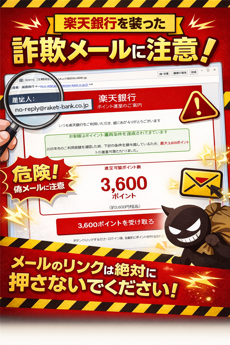 まとめ 本件は、過去の事例と比較しても「ポイント進呈」という餌の提示が非常に具体的で、騙されやすい構成です。楽天銀行の公式サイトでも同様の手口への注意喚起がなされています。 |