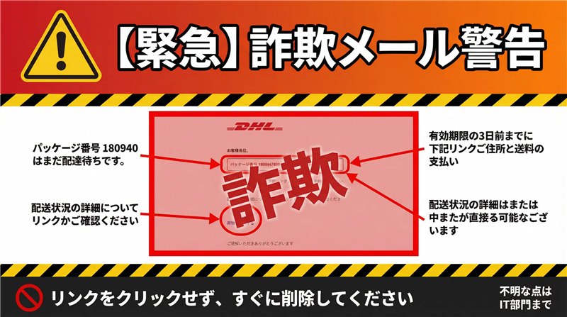| | | ■ 専門家による解析レポート 【メールの感想】 本メールはDHLのブランドカラーを模倣し、フッターの免責事項まで記載することで「公式感」を演出しています。しかし、日本語の言い回し(「適応時間」など)に不自然な直訳感が残っており、機械翻訳を利用した海外からの攻撃である可能性が非常に高いです。 【デザインの特徴】 ロゴを配置し、赤い枠線で荷物番号を強調する手法は、ユーザーに視覚的な焦りを感じさせるための古典的な心理戦術です。 【危険なポイントと対処法】 送信元アドレスの不一致: 表示名はDHLとなっていますが、実際のアドレスは「nfvc.cn」という中国ドメインです。公式(dhl.com)と全く異なるため、この時点で100%詐欺と断定できます。 対処法: メールを開封しただけであれば実害は少ないですが、リンク先で情報を入力してしまった場合は、即座にカード会社への連絡とパスワード変更が必要です。 ※DHL公式:不正取引への注意喚起はこちら