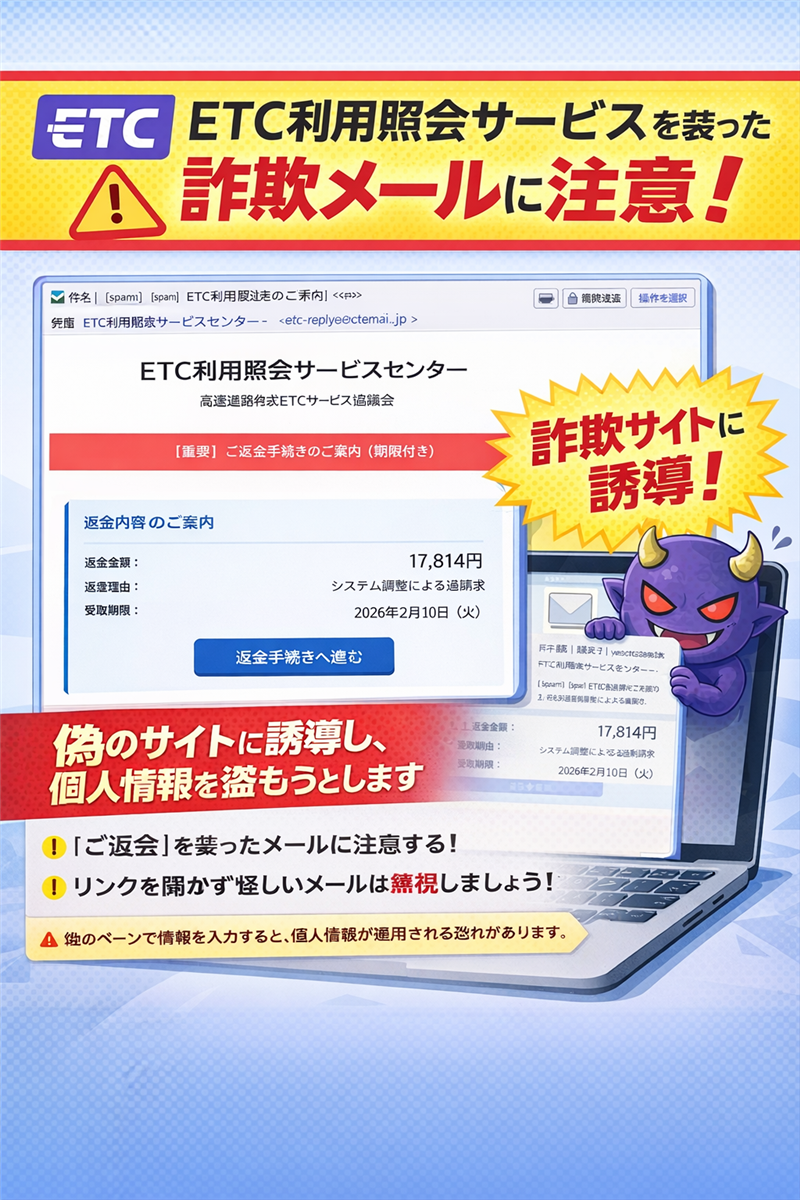 【調査報告】最新の詐欺メール解析レポート メールの解析結果とセキュリティ分析データ | 最近のスパム動向 今回ご紹介するのは「ETC利用照会サービス」を騙るメールですが、その前に最近のスパムの動向について解説します。2026年現在、公的サービスやインフラ企業を装い、「過剰請求の返金」や「アカウント停止」を予告して偽サイトへ誘導する手口が非常に巧妙化しています。