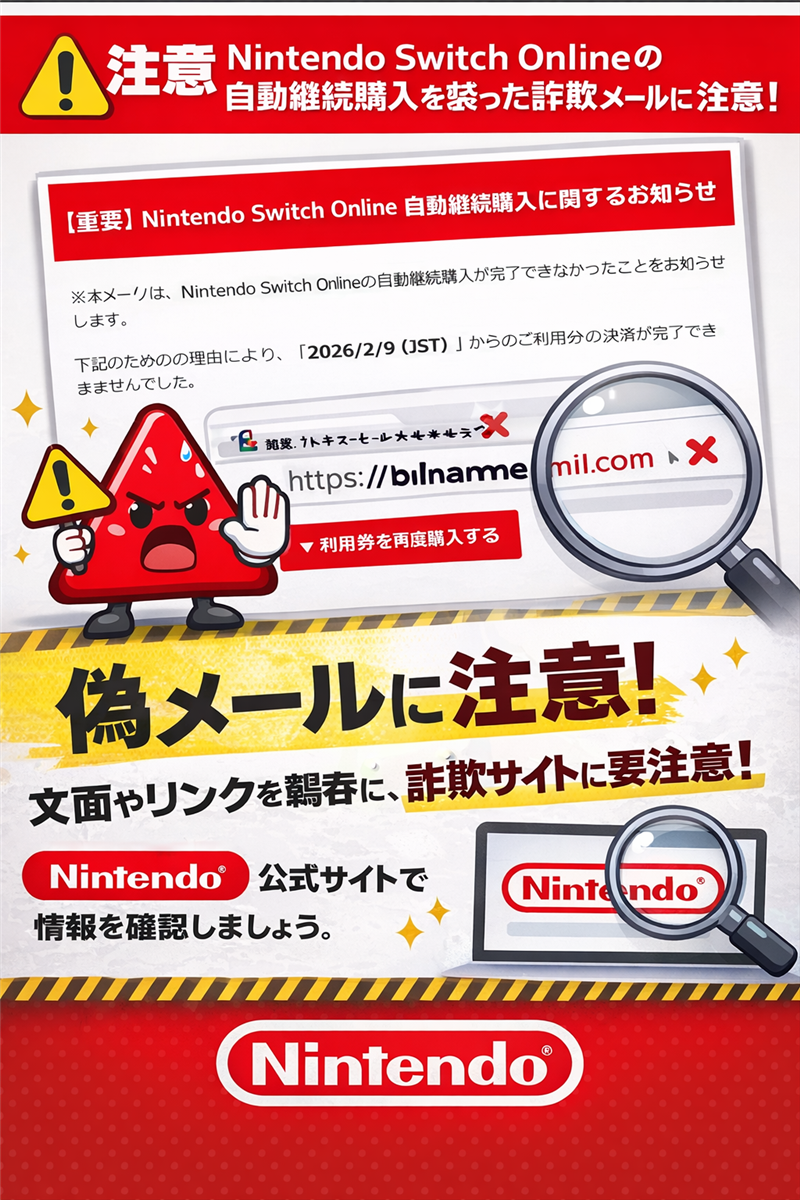 【注意喚起】「Nintendo Switch Online自動継続購入」を装う偽メールを調査