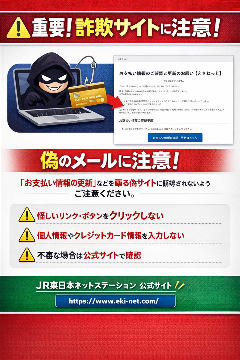 | メールのデザイン再現 ※できる限り忠実に再現していますが、本物の詐欺メールとデザインが異なる場合もあります。 えきねっと お支払い情報のご確認と更新のお願い【えきねっと】 申し訳ございません いつも「えきねっと」をご利用いただき、誠にありがとうございます。 現在、登録されているお支払い情報が無効になっていることが確認されました。 以下の原因が考えられます: - 発行元の金融機関が現在のクレジットカードでの「えきねっと」決済をサポートしていない