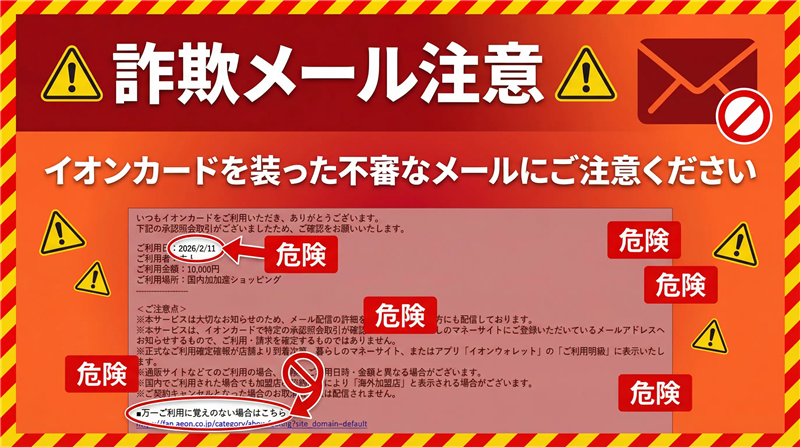 ■ メールの本文再現 ※できる限り忠実に再現していますが、本物の詐欺メールとデザインが異なる場合もあります。 いつもイオンカードをご利用いただき、ありがとうございます。 下記の承認照会取引がございましたため、ご確認をお願いいたします。 ご利用日:2026/2/11 ご利用者:本人 ご利用金額:10,000円 ご利用場所:国内加盟店ショッピング ——————– <ご注意点> ※本サービスは大切なお知らせのため、メール配信の許諾をいただいていない方にも配信しております。 ※本サービスは、イオンカードで特定の承認照会取引が確認された場合、暮らしのマネーサイトにご登録いただいているメールアドレスへお知らせするもので、ご利用・請求を確定するものではありません。 ※正式なご利用確定情報が店舗より到着次第、暮らしのマネーサイト、またはアプリ「イオンウォレット」の「ご利用明細」に表示いたします。 ※通販サイトなどでのご利用の場合、実際のご利用日時・金額と異なる場合がございます。 ※国内でご利用された場合でも加盟店の契約状況により「海外加盟店」と表示される場合がございます。 ※ご契約キャンセルとなった場合のお取消し情報は配信されません。 ■万一ご利用に覚えのない場合はこちら https://faq.aeon.co.jp/category/show/qmpjg?site_d●main=default ■カードの紛失・盗難に気づかれたらこちら https://faq.aeon.co.jp/category/show/uzr9p?site_d●main=default ■カードの不正利用や詐欺などの被害にあわないために、「本人認証サービスや無料セキュリティソフトなど安心・安全な機能のご利用」「カード番号等のお取扱いの注意点のご確認」をお願いいたします。 https://www.aeon.co.jp/rsgfm/sec●rity/ ■カード全般に関するお問い合わせ先はこちら https://www.aeon.co.jp/nlvlk/inq●iry/ イオンマークのカードを保有しておらず、当メールにお心当たりのない方は、大変お手数をお掛けいたしますが、その旨をお書き添えいただき下記アドレスまでお送りください。 mailto:netbranch@aeon.co.jp ※カード利用状況についてのお問い合わせはお受けできません。 このメールは送信専用です。ご返信をいただきましてもご回答いたしかねますのでご了承ください。 ——————– 発行会社:株式会社イオン銀行 業務受託会社:イオンフィナンシャルサービス株式会社 https://www.aeon.co.jp/ このメールに掲載された内容を許可なく転載することを禁じます。 | |