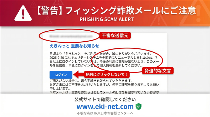 | メール本文の構造再現 できる限り忠実に再現していますが、本物の詐欺メールとデザインが異なる場合もあります。 えきねっと 重要なお知らせ 日頃より「えきねっと」をご利用いただき、誠にありがとうございます。 2026-2-20 にセキュリティシステムを全面的にリニューアルしましたため、7日以上にログインしていない方は、今後の利用に支障が出ないよう、このメールを受信後、早急にログインをして個人情報を更新してくださ。 ご記入がない場合は、退会手続きを取らせていただきます。 お客さまにはご不便をおかけいたしますが、何卒ご理解を賜りますようお願い申し上げます。 ※本メールは、重要なお知らせとしてメールの配信を希望されていないお客さまにもお送りさせていただいております。 発行:株式会社JR東日本ネットステーション 〒151-0051 東京都渋谷区千駄ヶ谷5-27-11 アグリスクエア新宿4階 | | 危険なポイントと対処法 1. 送信者アドレスの不一致: 本物は「@eki-net.com」ですが、今回は「@funncp.cn」という中国ドメインから送信されています。 2. 日本語の不自然さ: 「更新してくださ」といった、文末の脱字が見受けられます。 3. 恐怖を煽る期限設定: 「退会手続きを取らせていただきます」という表現で、冷静な判断を奪おうとしています。