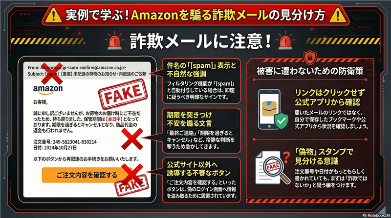 【調査報告】最新の詐欺メール解析レポート 管理番号:SEC-AMZ-2026-0212 / 解析ステータス:高危険度判定 | 最近のスパム動向と前書き 2026年現在、ECサイトを騙るフィッシング詐欺は「配送不可」を口実にしたものが主流となっています。特にAmazonを装うケースでは、公式のロゴや配色を極めて精巧に模倣しており、一見しただけでは判別が困難です。本レポートでは、受信したメールのヘッダー情報およびリンク先のサーバー環境を徹底的に解析し、その正体を暴きます。