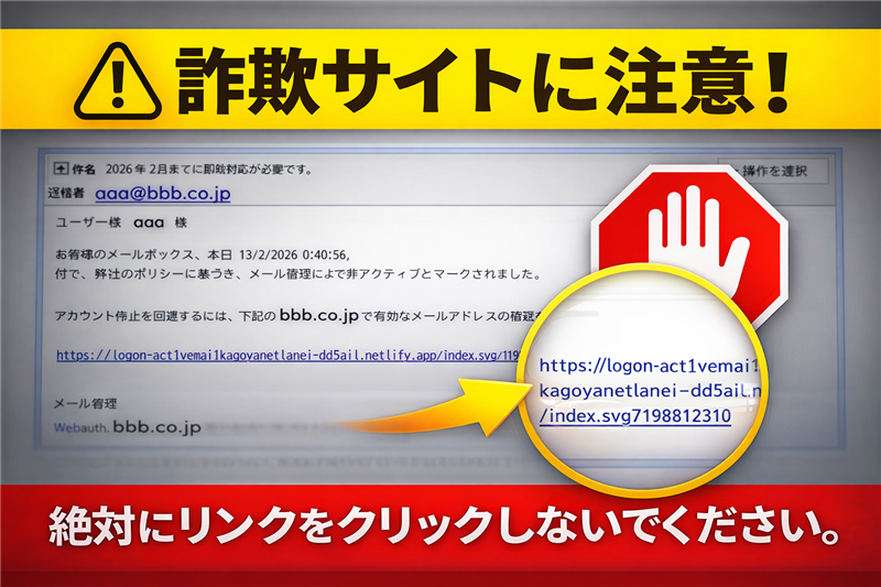 過去の事例と比較しても、本文中に正規ドメインを連呼する手法は巧妙化しています。メール内のリンクは決してクリックせず、必ずブックマークから公式サイトへアクセスしてください。