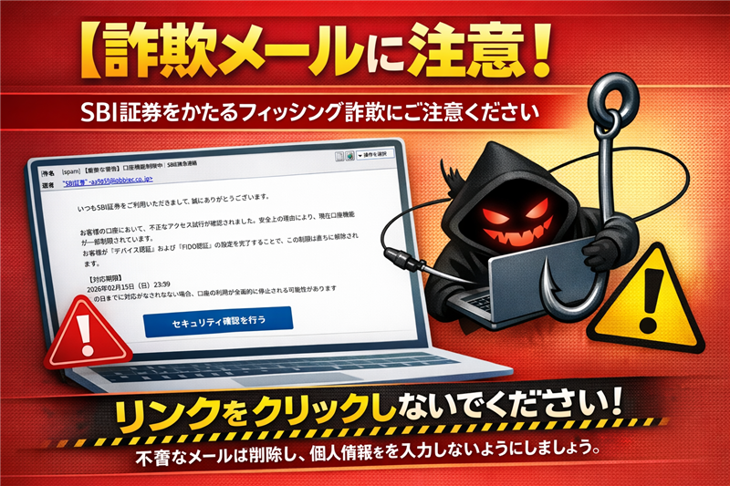 【調査報告】最新の詐欺メール解析レポート SBI証券を装った巧妙なフィッシング手法の技術分析 | 最近のスパムメール動向について 今回ご紹介するのは「SBI証券」を騙るメールですが、その前に最近のスパムの動向について解説します。2026年に入り、金融機関を装うスパムは「具体的なセキュリティ用語(FIDO認証など)」を使い、受信者のリテラシーを逆手に取る手法が目立ちます。 | 前書き 本レポートでは、実在するサービス名を悪用し、口座制限という偽の口実で情報を盗み取ろうとする詐欺メールを解析します。送信元サーバーの正体や、誘導先の「偽の確認画面」の正体を暴きます。 | メールの解析結果 メールヘッダー情報 件名: [spam] 【重要な警告】口座機能制限中|SBI証券より緊急連絡 ※[spam]判定の理由:送信元ドメインと送信サーバーの不一致、および既知の詐欺パターンへの合致によるものです。 送信者: “SBI証券” <aa9z5fj@sbisec.co.jp> 受信日時: 2026-02-13 12:14 メール本文の忠実再現 いつもSBI証券をご利用いただきまして、誠にありがとうございます。 お客様の口座において、不正なアクセス試行が確認されました。安全上の理由により、現在口座機能の一部が制限されています。 お客様が『デバイス認証』および『FIDO認証』の設定を完了することで、この制限は直ちに解除されます。 【対応期限】 2026年02月15日(日) 23:59 この日までに対応がなされない場合、口座の利用が全面的に停止される可能性があります ▼緊急セキュリティ設定(公式ページ) 設定後は即時に利用制限が解除されます。安全な取引継続のため、早急なご対応をお願いいたします。 ※本メールは送信専用です。 ※心当たりのない場合は本メールを破棄してください。 発行:株式会社SBI証券 金融商品取引業者、商品先物取引業者 住所:〒106-6019 東京都港区六本木1-6-1 泉ガーデンタワー19F 登録番号:関東財務局長(金商)第44号 加入協会:日本証券業協会、金融先物取引業協会、 第二種金融商品取引業協会、日本STO協会、日本商品先物取引業協会、 日本暗号資産等取引業協会 Copyright (C) SBI SECURITIES Co., Ltd. All Rights Reserved. | ※できる限り忠実に再現していますが、本物の詐欺メールとデザインが異なる場合もあります。 | | 専門家による詳細解説 メールの感想とデザイン評価 このメールは非常に「本物っぽい」質感を備えています。特にフッターの住所や登録番号はSBI証券の実在のデータを盗用しており、視覚的な信頼性を高めています。 このメール特有の怪しい点 最も不自然なのは「FIDO認証」という技術用語を、あたかも後から設定が必要な手続きのように説明している点です。本来、認証設定はログイン後に行うものであり、メールのリンクから直接誘導することはありません。 公式サイトの注意喚起 SBI証券の公式サイトでも、フィッシングメールに対する強い注意喚起が出ています。 【公式】フィッシングメール等にご注意ください | Received(送信元情報)の解析 メールヘッダーに隠された配送経路の記録です。ここには偽装できない送信者の真実が記されています。 from infoo2.smshea.vip (unknown [204.194.51.121]) このカッコ内のIPアドレスは、送信に利用されたサーバーの「本物の住所」であり、信頼できる情報です。 | Receivedのドメイン | smshea.vip(SBI証券のドメイン sbisec.co.jp とは全く無関係。明らかに偽装されています) | | 送信IPアドレス | 204.194.51.121(送信者が実際に利用したIPアドレス) | | ホスティング/ホスト名 | infoo2.smshea.vip(攻撃者が用意したレンタルサーバー、または乗っ取られたホスト) | | 設置国名 | United States (アメリカ合衆国) | メール回線関連情報 ドメイン登録日を調査したところ、数ヶ月以内に取得されており、スパム送信のために準備された可能性が高いです。 👉 ip-sc.net でこの送信元のセキュリティ確認を行う