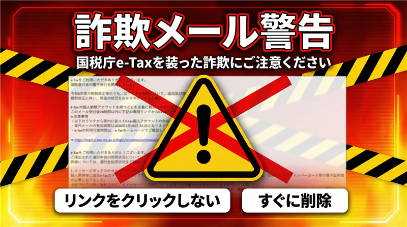 現在、「国税庁」や「税務署」を名乗り、還付金手続きや税制改正を口実にしたスパムメールが大量に流通しています。これらは送信ドメインを偽装し、一見公式サイトに見えるURLを提示しますが、最終的には海外の攻撃用サーバーへ誘導されます。本レポートでは、実際に届いた検体を基に、その危険な構造を解剖します。
