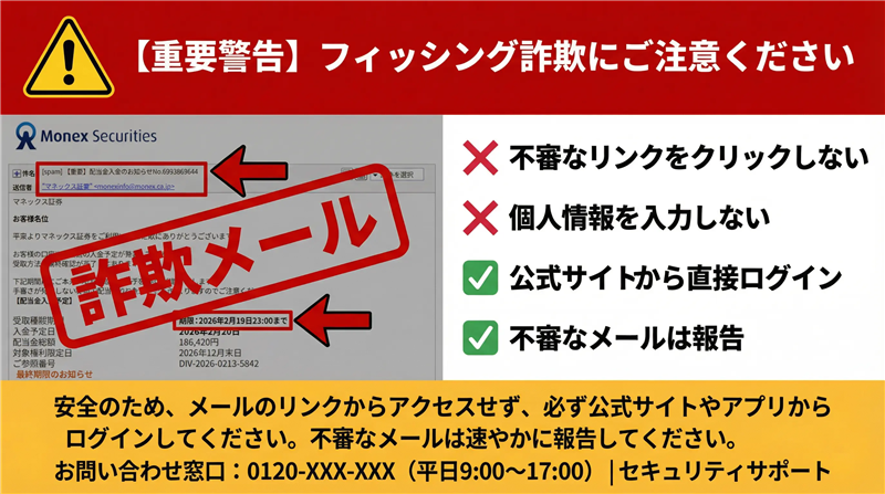 | ■ まとめ・注意点と対処方法 過去の事例と比較しても、配当金を餌にしたこの手口は非常に悪質です。 1. リンクは絶対に開かない: メール内のボタンは物理的なリンクを排除した本レポートのような形式で確認してください。 2. 正規サイトをブックマーク: 証券会社のログインは必ず自分で保存したブックマークから行ってください。 3. 公式情報の確認: マネックス証券の公式サイトでも同様の詐欺に対する強い警告が出ています。 公式サイトの注意喚起を再度確認する | |