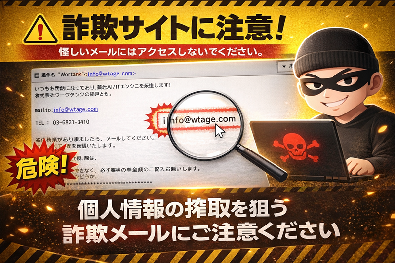 【調査報告】最新の詐欺メール解析レポート 本レポートは、収集された不審メールおよびリンク先の動的解析結果です | 最近のスパム動向 今回ご紹介するのは「株式会社ワークタンク」を騙るメールですが、その前に最近のスパムの動向を解説します。2026年現在、BtoB(企業間取引)を装った「人材紹介・エンジニア派遣」型のスパムが急増しています。これらはビジネスメールの形式をとり、受信者の警戒心を解きながら個人情報や案件情報を巧みに引き出そうとするのが特徴です。