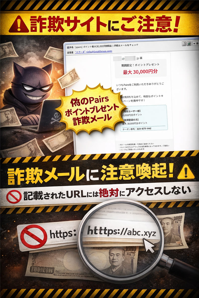 【調査報告】最新の詐欺メール解析レポート メールの解析結果:マッチングアプリ「Pairs」を騙るフィッシング詐欺 | 最近のスパム動向 今回ご紹介するのは「Pairs(ペアーズ)」を騙るメールですが、その前に最近のスパムの動向を解説します。2026年現在、バレンタインや新生活といった季節のイベントに合わせ、マッチングアプリやECサイトを装った「ポイント付与」を謳う詐欺が多発しています。特に、正規サイトのドメイン(.lvや.jp)を巧妙に模倣したサブドメインを作成し、ユーザーを視覚的に欺く手法が目立ちます。 | メール受信基本データ | 件名 | [spam] ポイント最大30,000円分贈呈中!詳細はメールをチェック | | 件名の見出し(spam) | 件名に付与された「[spam]」は、サーバーのスパムフィルターがメールのヘッダーや本文の構文、送信元IPのレピュテーション(評価)に基づき、自動で「有害」と判定したことを示しています。 | | 送信者 | “ペアーズ” <info@liveatthevue.com> | | 受信日時 | 2026-02-14 21:01 | 【重要】送信者アドレスが info@liveatthevue.com となっており、受信者のメールアドレスを盗用して送信されています。公式サイトとは一切無関係なドメインです。 | メール本文の再現 ※できる限り忠実に再現していますが、本物の詐欺メールとデザインが異なる場合もあります。 example@address.jp 様(※受信者のメールアドレスがそのまま宛名になっています) 期間限定!ポイントプレゼント 最大 30,000円分 いつもPairsをご利用いただきありがとうございます。 感謝の気持ちを込めて、特別なポイントキャンペーンを実施中です! 【既存ユーザー様】 10,000円分ポイント 【新規登録の方】 最大 30,000円分ポイント クーポン番号:3634-8275-9442 | ※本メールの無断転載・利用はご遠慮ください ※本メールのFromアドレスは送信専用となっております。ご返信いただいてもご回答いたしかねます ※Pairsに関するお問い合わせは下記までお願いします。 ■お問い合わせ先: 株式会社エウレカ ペアーズカスタマーサポート h**ps://support.pairs.lv/**** ▼メール配信停止を希望される方は以下より設定の変更をお願いします。 h**ps://pairs.lv/app/settings/notifica**** ▼現在ログインしていない場合には、以下に沿って設定の変更をお願いします。 h**ps://support.pairs.lv/hc/ja/articles/115007254108 ▼ペアーズに登録した覚えがないにも関わらずメールが配信されている場合には、以下に沿ってお問い合わせください。 h**ps://support.pairs.lv/hc/ja/articles/26434914736409 ■発行 株式会社エウレカ ペアーズ運営事務局 Unsubscribe | | 専門的解析レポート ■ メールデザインと不自然な点 画像を確認すると、冒頭の宛名が受信者の「氏名」ではなく、送信先の「メールアドレスそのもの」になっていることが分かります。これは、攻撃者が名簿リストから機械的にメールを送りつけている決定的な証拠です。本物のPairsであれば、登録されたニックネームや氏名で呼びかけます。 ■ このメール特有の怪しい点 公式ヘルプセンターのURL(support.pairs.lv)が記載されていますが、これらはユーザーを安心させるための装飾に過ぎません。実際のメインボタンや「ポイント詳細」のリンク先は全く別のドメインに設定されています。また、文末の「Unsubscribe」など、国内サービスとしては不自然な英語表記が混在しています。 [公式確認] Pairsによる不審なメールへの注意喚起 | メール回線関連情報(送信元) これは送信に利用された生の情報であり、カッコ内のIPアドレスは偽装不可能な、信頼できる送信者情報です。 | Received(送信元) | from liveatthevue.com (liveatthevue.com [160.251.206.188]) | | 送信IPアドレス | 160.251.206.188 | | ホスト / ISP | GMO Internet Group, Inc. (ConoHa) | | 設置国 | 日本 (Japan) | | ドメイン登録日 | 2026-02-01頃取得。非常に新しく、攻撃専用の使い捨てドメインと判断されます。 | [ ip-sc.net 解析ページで詳細を確認 ] | サイト回線関連情報(誘導先) メール本文に直書きされていますが、実際には巧妙に偽装されたリダイレクトURLです。 | リンク先URL | h**p://click.liveatthevue.com/campaign/clicked/?log_id=MTU4NDY4ODc…(以下伏せ字) | | 稼働状況 | アクセス不能(DNSエラー) | | ドメイン | click.liveatthevue.com | | IPアドレス | 160.251.206.188 | | 国名 | 日本 (Japan) | 現在「このサイトにアクセスできません」というエラーが表示されますが、これはサーバーがダウンしたか、セキュリティ機関によってドメインが凍結された可能性があります。登録日が最近であるドメインが即座に不通になるのは、典型的な詐欺サイトの挙動です。 [ https://ip-sc.net/ja/r/160.251.206.188 ] | 詐欺サイトの画像(現状) 【リンク先の画面:DNS_PROBE_STARTED】