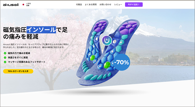 誘導先:get-akusoli.com のトップ画面。富士山を背景に使い、日本の消費者を安心させようとする工作が見られます。