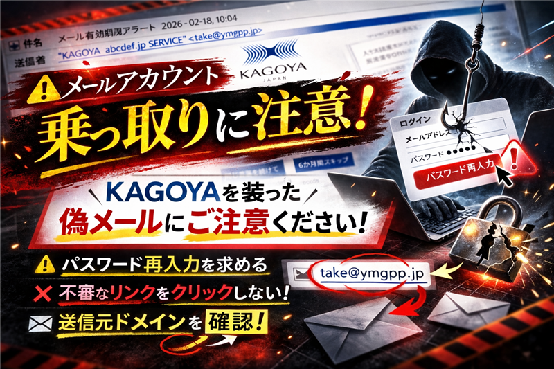 | | 件名 | [spam] メール有効期限アラート 2026-02-18, 오전 10:04 | | 「[spam]」の理由 | サーバーのセキュリティフィルターが、このメールの送信元や構造を「既知のスパムパターン」と合致したと判断し、強制的に付与した識別子です。 | | 送信者 (From) | “KAGOYA abcdef.jp SERVICE” <t-take@ymghp.jp> ←「abcdef.jp」は受信者のドメインを盗用 | | ドメイン盗用 | 表示名に含まれる「abcdef.jp」は受信者のドメインを盗用したものです。実際の送信アドレス「ymghp.jp」はカゴヤとは一切関係ありません。 | | 受信日時 | 2026-02-18 10:04 | ■ メールのデザイン(忠実再現) ※できる限り忠実に再現していますが、本物の詐欺メールとデザインが異なる場合もあります。 |  重要なセキュリティに関するお知らせ 現在のパスワードを引き続き使用し、ログインの中断を回避するには、今すぐパスワードを再入力してください。以下のいずれかのボタンをクリックしてすぐに確認してください。 | 製品: administrator | 関連製品名: abcdef.jp | 有効期限: 7日間 | | | ■ Received (送信元情報) の解析 | | 送信元IPアドレス | 211.119.252.125 (これは送信に利用した情報であり、信頼できる送信者情報です) | | ホスト名 | WIN-MA1KSKNRKH8 (攻撃者が管理するWindowsサーバー) | | 設置国 | Korea, Republic of (韓国) | | 回線詳細解析 | https://ip-sc.net/ja/r/211.119.252.125 | ■ リンク先ドメイン・サイト解析 | | 偽装URL | https://sistema.radcare.com.br/f●●quota/jp.html#…(伏字含む) | | ブロック状況 | ウイルスバスター、Googleセーフブラウジングにより既に「危険」と判定され、遮断されています。 | | ドメイン名 | radcare.com.br | | IPアドレス | 177.103.132.31 | | ドメイン登録日 | 2025年12月15日 (作成日) / 2026年02月10日 (最終更新) | | 最近である理由 | 本物のサービス提供会社は10年以上の運用実績があるドメインを使用します。登録から数ヶ月、あるいは直近で更新されたドメインは、攻撃者がこの詐欺のために用意した、または休眠ドメインを乗っ取った典型的な証拠です。 | | サイト回線情報 | https://ip-sc.net/ja/r/177.103.132.31 | ■ 詐欺サイトの画像(リンク先の状況) 誘導先は、以下のような偽のログインページとなっています。 | ■ 注意点と対処法 今回の検体は、ロゴの使用や受信者情報の挿入など、非常に「本物らしく」見せる工夫が凝らされています。しかし、送信ドメインやリンク先のドメイン登録日を確認すれば、容易に不正を見抜くことができます。 ・対処法: メールを即削除し、カゴヤ公式ページ以外でパスワードを入力しないでください。 ・比較: 過去の事例と比較しても、今回は「日本語の不自然さ(同じ言葉を続けて 等)」が際立っています。 カゴヤ・ジャパン公式 注意喚起:フィッシングメールにご注意ください | |