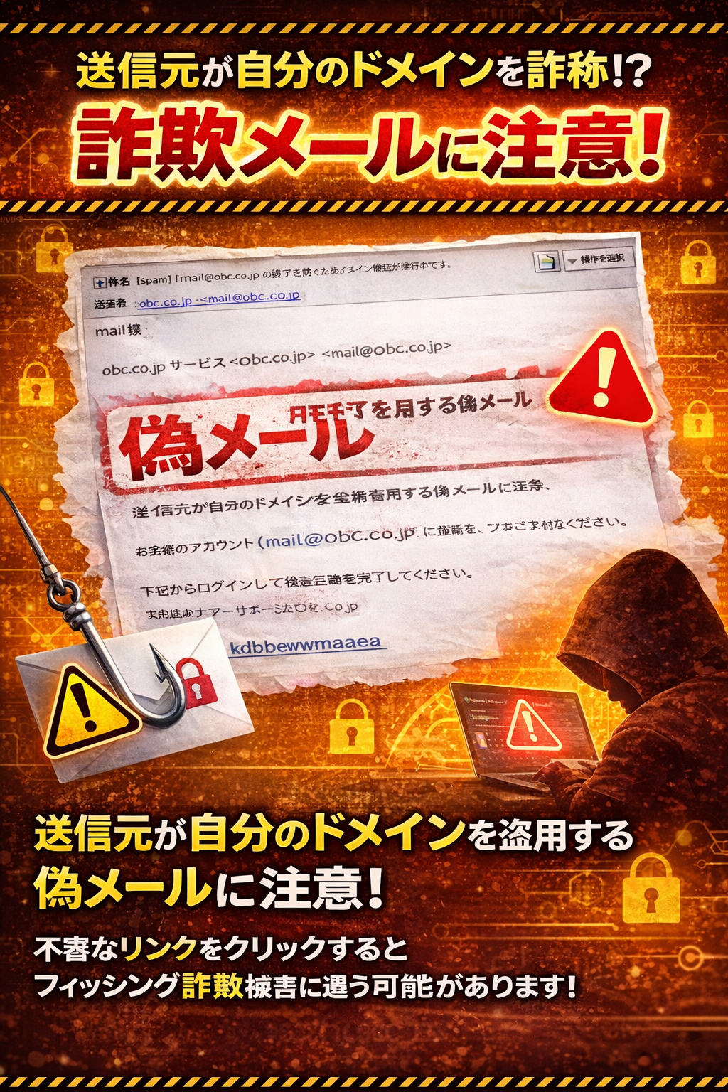 | ▼ 受信メール解析データ | 件名 | [spam] !mail@ abc.co.jp の終了を防ぐためにドメイン検証が進行中です。 | | 件名の見出し | 冒頭に「[spam]」が付与されています。サーバー側で既に危険性が検知されている証拠です。 | | 送信者 | “abc.co.jp” <mail@ abc.co.jp> | | 受信日時 | 2026-02-19 8:58 | 【重要】送信者が「mail@ abc.co.jp」となっており、受信者のメールアドレスをそのまま盗用しています。自分自身のアドレスから届いたと錯覚させる悪質な手法です。 | ▼ メール本文の再現(解析用) ※できる限り忠実に再現していますが、本物の詐欺メールとデザインが異なる場合もあります。 mail様abc.co.jp サービスをご利用いただきありがとうございます。 お客様のアカウント(mail@ abc.co.jp )のパスワードの有効期限が切れています。ただちにご対応ください。 2026-2-19 a.m. 8:58:03 下記からログインしてパスワードを更新してください。有効なユーザー名とパスワードでログインできない場合は、アカウントが停止され 390;いる可能性があります。 こちらからログインして操作を完了してください。 abc.co.jp カスタマーサポートチーム abc.co.jp 参照番号 : kdbbewvmaea | | ▼ 専門的考察:メールのデザインと犯人の意図 ■ 犯人の目的 このメールの目的は、「ウェブメールのログイン認証情報(ユーザー名・パスワード)の窃取」です。取得したアカウントは、更なるスパムメールの送信台座や、組織内ネットワークへの侵入の足掛かりとして悪用されます。 ■ デザインと異常点 本文中に「停止され 390;いる」といった文字化けが見られます。また、宛名が「mail様」とアドレスの@より前を機械的に引用している点、文末に謎の「参照番号」を付与して公的な通知を装っている点が非常に怪しいポイントです。