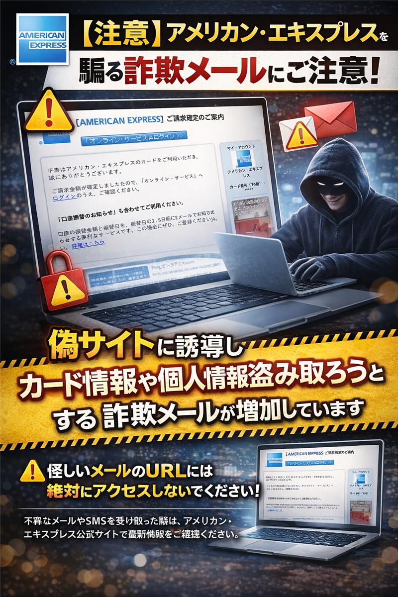 今回ご紹介するのは「アメリカン・エキスプレス」を騙るフィッシングメールです。2026年に入り、確定申告や年度末の決算時期を狙った「請求金額確定」を装う手口が激増しています。特に、公式のロゴや配色を完全に模倣し、受信者の焦りを誘うデザインが主流となっており、一見しただけでは正規メールと区別がつかない高度な偽装が施されています。