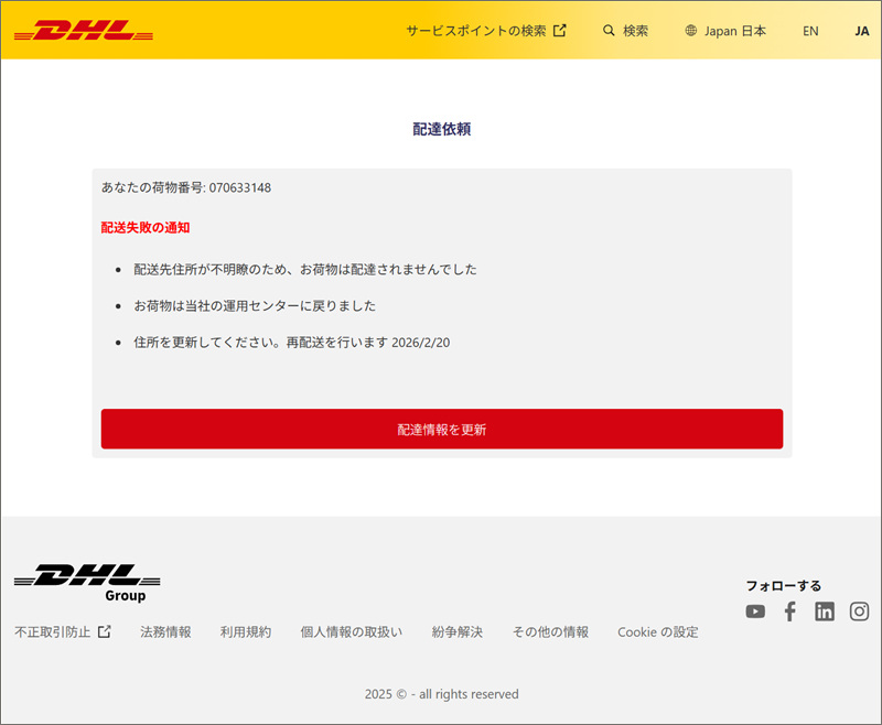 【警告】DHL発送状況:アクションが必要|詐欺メール解析レポート