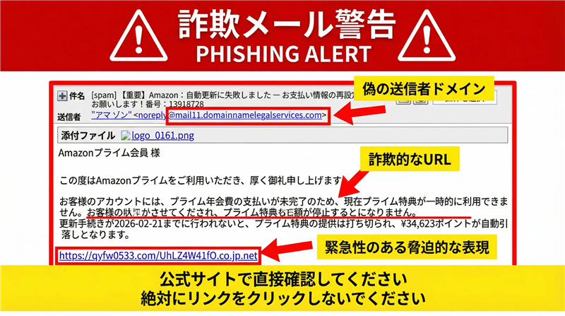 今回ご紹介するのは「Amazon」を騙るメールですが、その前に最近のスパムの動向を解説します。2026年現在、ECサイトの自動更新やポイント失効を騙り、ユーザーの焦りを誘発する手法が主流です。特に、実在する住所やロゴを巧妙に配置し、一見して公式からの通知と誤認させる「視覚的偽装」が高度化しています。