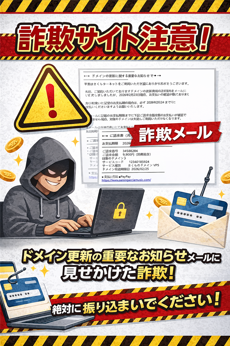 | メール基本情報 | 件名 | [spam] [さくらインターネット]《再々請求》ドメイン廃止のお知らせ | | 件名の見出し(解析) | [spam]が付与されている理由は、送信元サーバーのSPF設定と実際の送信元IPが合致しない「なりすまし」特有の矛盾を、受信サーバー側が検知したためです。 | | 送信者 | お名前.com <info@ome-transport.co.jp> | | 受信日時 | 2026-02-24 17:17 | 送信者に関する情報: 「お名前.com」と表示されていますが、実際のメールアドレス(info@ome-transport.co.jp)は全く無関係な運送会社のドメインです。もし送信者が “aaa@bbb.co.jp” のように自分自身のアドレスであれば、受信者のメールアドレスが盗用され、送信元に偽装(なりすまし)されています。 | メール本文(画像内容を忠実に再現) ※できる限り忠実に再現していますが、本物の詐欺メールとデザインが異なる場合もあります。リンク先URLは安全のため伏せ字化し無効化しています。 ◆◇◆ ドメインの更新に関する重要なお知らせです ◆◇◆ 平素はさくらインターネットをご利用いただき誠にありがとうございます。 先日、ご契約いただいておりますドメインの更新費用の再請求案内をメールにて お送りいたしましたが、2026年2月23日現在、お支払いの確認が取れておりません。 対象のドメインの更新をご希望の場合は、必ず 2026年2月24日 までに お支払いくださいますようお願いいたします。 ※本メールに記載のお支払期限までに下記ご請求金額全額のお支払いが確認 できない場合、対象のドメインは失効しご利用いただけなくなります。 ※本メールと行き違いにてお支払いいただいた場合、または廃止申請済みの 場合は何卒ご容赦下さい。 ━━━━━━━━━━━━━━━━━━━━━━━━━━━━━━━━━━━ ◇◆◇ ご請求書(再々請求) ◇◆◇ ━━━━━━━━━━━━━━━━━━━━━━━━━━━━━━━━━━━ お支払期限 2026年2月24日 ─────────────────────────────────── ご請求番号 34588284 ご請求金額 9,900円(消費税含) 《対象のドメイン》 サービスコード 12340185924 サービス種別 さくらのドメイン VPS ドメイン有効期限日 2026/02/25 ━━━━━━━━━━━━━━━━━━━━━━━━━━━━━━━━━━━ ■支払い方法 ■PayPay hxxps://www.aarongarciam●●●●.com/ 現在の有効期限をもって廃止をご希望の場合は、以下サポートページを ご参考に廃止手続きをお願いいたします。 ▼ドメインを廃止したい hxxps://help.sakura.ad.jp/domain/2565/ | | 専門解析:犯人の目的と手口 このメールの目的: ドメイン失効という「事業の停止」を想起させる脅迫的な内容で、被害者を偽の決済サイトへ誘導し、PayPay残高の詐取および会員ログイン情報の盗取を行うことです。 メールのデザインと特徴: さくらインターネット公式の文面を模倣しつつ、2026年2月23日時点の未払いを、翌日の24日までに支払えと迫る極めてタイトなスケジュールで判断力を奪いにきています。「PayPay」という個人の決済手段を公式が強制することは通常あり得ません。 危険なポイント: 送信元が「お名前.com」でありながら内容は「さくらインターネット」であるという致命的な不一致があります。また、リンク先が aarongarciamusic.com という音楽関連と思われる全く無関係な海外ドメインになっており、これが詐欺サイトの本体です。 公式サイトの注意喚起: さくらインターネットでは同様の事象に対し、強く注意を呼びかけています。 公式:なりすましメールに関する注意喚起 | メール回線関連情報(Received解析) | Received(送信者) | from sunhaidandan.com (unknown [163.43.129.84]) | | IPアドレス(信頼値高) | 163.43.129.84 | | ホスティング/レンタルサーバー | SAKURA Internet Inc. | | 設置国 | Japan (日本) | | ドメイン登録日(WHOIS) | sunhaidandan.com:登録日は最近であり、この攻撃のために取得、あるいは既存サーバーが踏み台にされた可能性が高いです。 | → ip-sc.net で送信回線の詳細解析を確認する | リンク先サイトの解析(詐欺サイト本体) 本文内の「PayPay」リンクをクリックした際の接続先データです。 | リンク先URL | hxxps://www.aarongarciam●●●●.com/ (伏字を含む) | | IPアドレス | 104.21.75.143 | | ホスティング会社 | Cloudflare, Inc. | | 設置国 | United States (アメリカ合衆国) | | ドメイン登録日 | 登録日は数年前ですが、直近でネームサーバーがCloudflareに変更されています。これは「放置ドメインの買収・乗っ取り」による攻撃基盤の再利用が疑われます。 | | 稼働状況・ブロック | 稼働中。 ウイルスバスター等のセキュリティソフトによる遮断を回避するため、CAPTCHA画面を挟む巧妙な細工が施されています。 | リンク先サイトの画像(証拠) ▼ アクセス直後に表示される、偽の「セキュリティチェック成功」画面  「成功しました!」と表示されますが、これはCloudflareの機能を悪用した「本物の人間かどうか」の確認であり、安全を保証するものではありません。 → ip-sc.net でサイト回線の詳細解析を確認する | まとめと