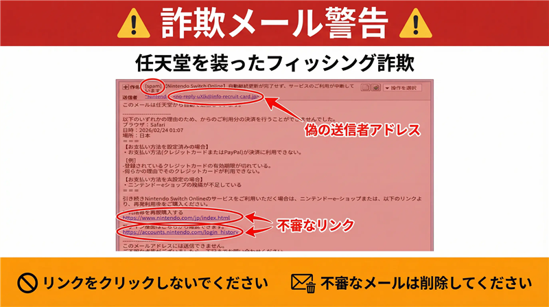 【調査報告】最新の詐欺メール解析レポート メール解析結果:Nintendo Switch Onlineを騙る決済不正通知 | ■ 最近のスパム動向 2026年2月現在、新生活の準備や年度末に向けたサブスクリプションサービスの更新時期を突いた攻撃が激化しています。特に「Nintendo Switch Online」を騙る手法は、ファミリープラン等の高額決済エラーを装い、ユーザーの焦りを誘ってクレジットカード情報を入力させるのが特徴です。