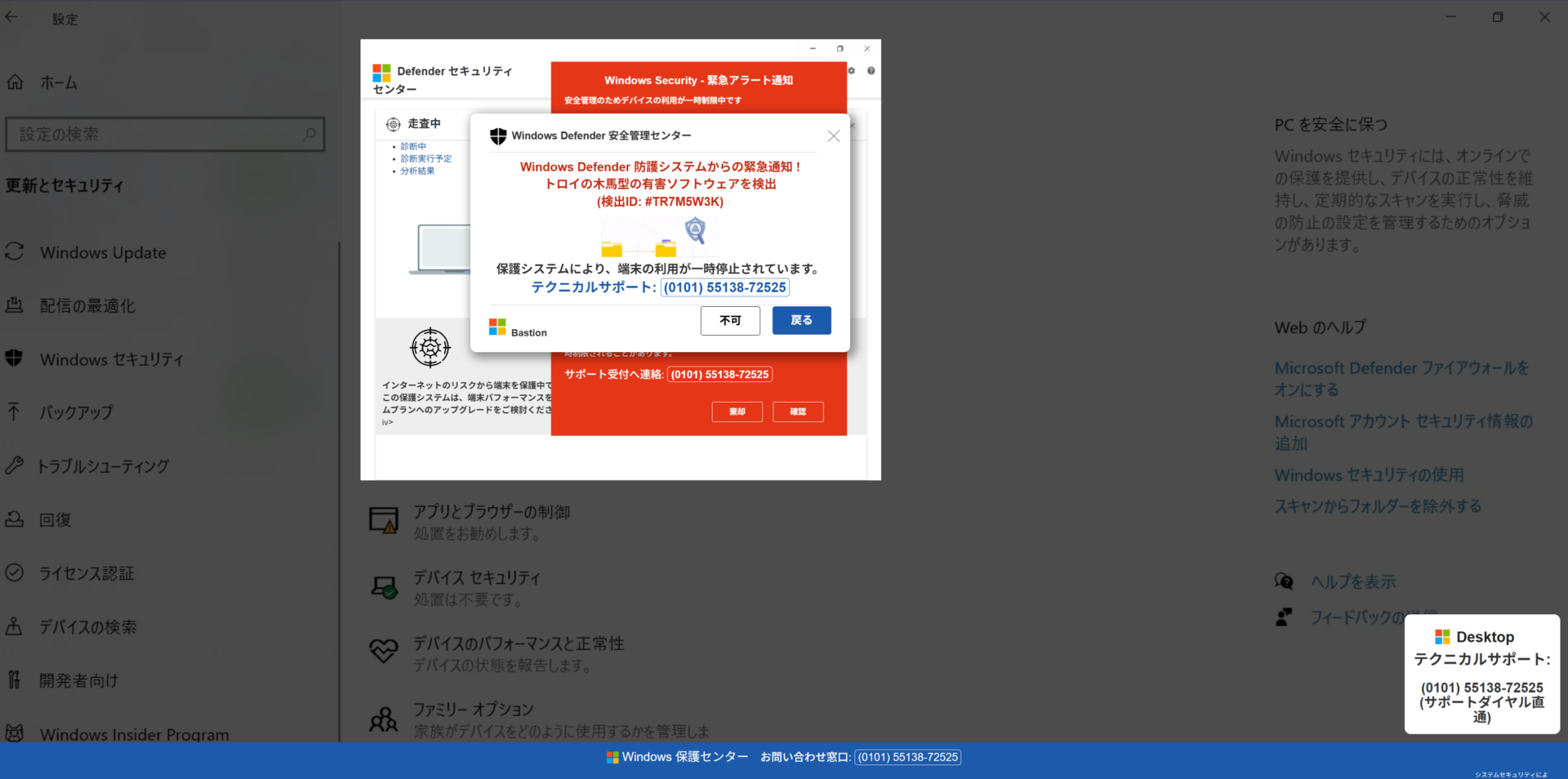 | | ■ リンク先ウェブサイトの危険性評価 | リンク箇所:「本人確認とパスワードの変更をお願いします」 誘導先URL:hXXps://bulavudir.z16.web.core.windows.net/yefhr0vvahbr.html(※一部を伏せ字にして無効化) | リンク先IPアドレス | 13.107.246.33 | | ドメイン | bulavudir.z16.web.core.windows.net | | ホスティング事業者 | Microsoft Corporation (Azure Web Hosting) | | サーバー設置国 | アメリカ合衆国 (United States) | リンク先の詳細回線分析: https://ip-sc.net/ja/r/13.107.246.33 | ■ 詐欺サイトの実態(サポート詐欺) このリンクをクリックすると、ウイルスバスターやGoogle Chromeによって「危険なサイト」として警告が表示されますが、それを回避して進むと、以下のような「偽のWindows Defender警告」が表示されます。  稼働状況: 現在稼働中(2026-02-26時点)。ドメイン登録日は数日以内と非常に新しく、典型的な「使い捨てドメイン」による攻撃です。 | ■ 推奨される対応とまとめ このメールは、受信者の焦りを煽り、サポート詐欺の電話番号へと誘導する悪質なものです。 1. メールの破棄: 宛名が記載されておらず、送信元が自身のドメインを偽装している時点で100%詐欺です。即座に削除してください。 2. パスワード変更の不要: メール内のリンクからは絶対にログインしないでください。 3. 公式情報の確認: サービス提供元の公式サイトにて、同様の注意喚起が出ていないか必ず確認してください。 過去の類似事例と比較しても、今回は技術的な隠蔽工作(ベトナム経由の送信)が目立ちます。十分に注意してください。 | |