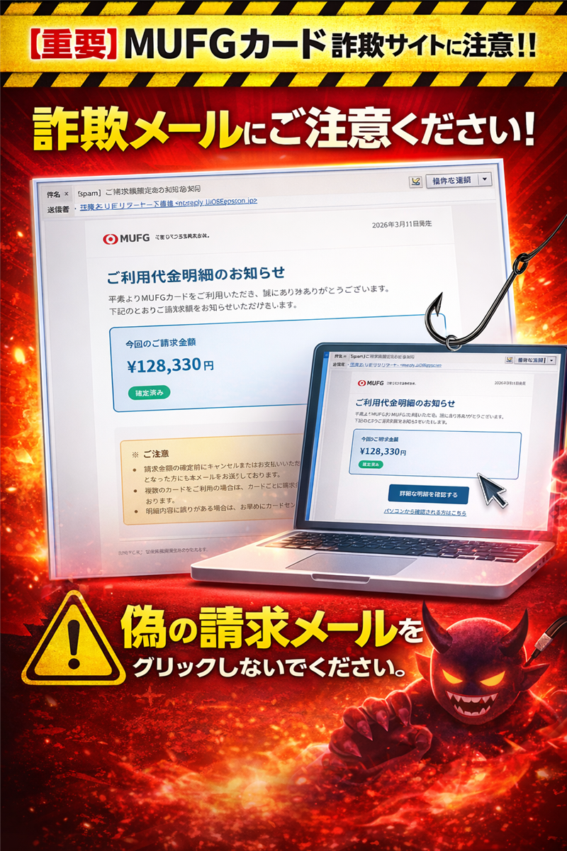 ご利用代金明細のお知らせ 平素よりMUFGカードをご利用いただき、誠にありがとうございます。 下記のとおりご請求額をお知らせいたします。 お支払い情報 | ご利用カード | MUFGカード | | お支払い日 | 2026年3月4日 (火) | | お支払い方法 | 口座自動振替 | | 支払区分 | 一括払い | https://mufg-cf.cbff***.com/mitsubishi/co.jp/ パソコンから確認される方はこちら ※ ご注意 ・ 請求金額の確定前にキャンセルまたはお支払いいただいた場合、請求金額が0円となった方にも本メールをお送りしております。 | △ セキュリティに関する重要なお知らせ フィッシング詐欺や偽のカード利用確認メールにご注意ください。MUFGカードは、カード番号やパスワードをメールでお聞きすることはありません。 セキュリティ情報の詳細はこちら | | 危険なポイントと専門的考察 ■ 犯人の目的 このメールの目的は、「カード情報の窃取(フィッシング)」です。 12万円超という高額請求を見せることで、「不正利用されたのではないか?」という不安を植え付け、偽の明細確認ページへ誘導。 そこでカード番号、有効期限、セキュリティコード、そしてオンライン銀行の認証情報を入力させることが最終目的です。 ■ 巧妙なデザインと怪しい点 ロゴやフォント使いは本物と見紛うほど精巧です。しかし、宛名(〇〇様)が一切なく、一斉送信されている点が決定的な不自然さです。 また、三菱UFJニコス公式でも同様の手口に対して強い注意喚起が出ています。 【公式】フィッシングメールへの注意喚起