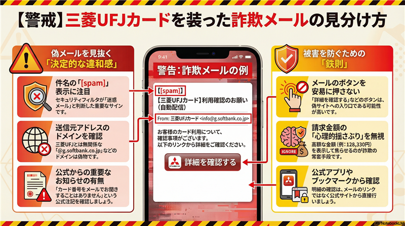 ■ 注意点と推奨される対応 1. URLの確認 :公式サイトのドメイン(cr.mufg.jp 等)と一字でも異なる場合は絶対に個人情報を入力しないでください。 2. ブロック情報の信頼 :Googleやウイルスバスターが警告を出す場合、そのドメインは既に「毒性」が証明されています。 3. 公式窓口の利用 :不審なメールを受け取った際は、以下の公式注意喚起ページを確認してください。 【公式】三菱UFJニコス:不審なメールへの注意喚起