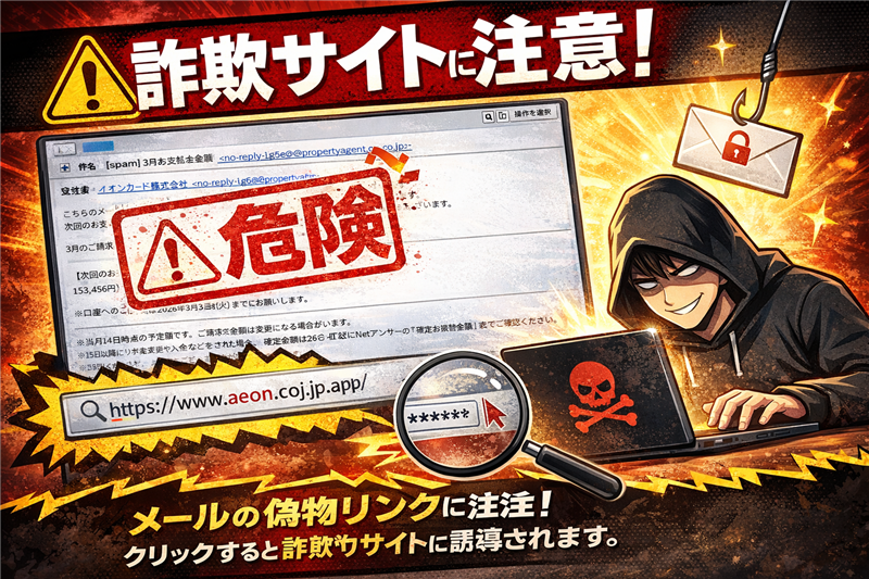 【調査報告】最新の詐欺メール解析レポート メールの解析結果:イオンカードを騙るフィッシング詐欺の徹底分析 | ■ 最近のスパムメール動向 今回ご紹介するのは「イオンカード」を騙るメールですが、その前に最近のスパムの動向について解説します。2026年に入り、新生活や年度末の決済が集中する時期を狙い、クレジットカードの「お支払金額確定」を装った攻撃が激増しています。特に、実在する企業のドメインを巧妙に偽装し、セキュリティフィルターを回避しようとする「ドメインスプーフィング」に近い手法が目立ちます。 | ■ メールの基本情報 | 件名 | [spam] 3月お支払金額のお知らせ | | 件名の見出し | 冒頭に [spam] とあるのは、受信サーバーがこのメールを配信経路や内容から「迷惑メール」と自動判定したためです。この表示がある時点で開封は危険です。 | | 送信者 | “イオンカード株式会社” <no-reply-jJg6@propertyagent.co.jp> | | 送信者解析 | ドメイン「propertyagent.co.jp」は実在する不動産会社のものですが、イオンカード(aeon.co.jp)とは一切関係ありません。第三者のドメインを盗用しているか、偽装された送信元です。 | | 受信日時 | 2026-02-26 13:58 | ▼ Received(送信元情報)の解析 以下のデータは送信に利用された実際の経路情報であり、カッコ内のIPアドレスは信頼できる送信者の証跡です。 | Received情報 | from C202602251020654.local (unknown [167.148.186.14]) | | 送信者IPアドレス | 167.148.186.14 | | ホスティング社 | Google Cloud (bc.googleusercontent.com 関連インフラ) | | 国名 | アメリカ合衆国 (United States) | | ドメイン登録日 | Whois解析の結果、送信ドメインは長期運用されていますが、今回の送信IP(Google Cloud)との整合性がなく、インフラが悪用されている可能性が高いです。 | 【メール回線解析エビデンス】 https://ip-sc.net/ja/r/167.148.186.14 (解析ページを表示) | ■ メール本文の再現 | ※できる限り忠実に再現していますが、本物の詐欺メールとデザインが異なる場合もあります。 こちらのメールはお支払いに関する大切なご連絡です。 次回のお支払金額をお知らせいたします。 いつもイオンマークのカードをご利用いただき、ありがとうございます。 本メールはWeb明細(環境宣言)にご登録いただいているお客さまにお送りしております。 3月のご請求額が確定いたしました。 【次回のお支払金額】 153,456円 【次回のお引き落とし日】 2026年3月4日(水) ※口座へのご準備は2026年3月3日(火)までにお願いします。 ———————————————————————- ※当月14日時点の予定額です。ご請求金額は変更になる場合がございます。 ※15日以降にリボ変更や入金などをされた場合、確定金額は26日9:00以降にNetアンサーの「確定お振替金額」欄にてご確認ください。 ※返金対応がある場合など、お支払金額が0円と表示される場合がございます。 ※15日以降にNetアンサー登録をされた方は、別途お届けするご利用明細書にてご確認ください。 ※次回のお支払金額のない方にもお送りしております。 ▼ご請求明細のご確認はこちら https://www.aeon.co.jp/a●●/ ※メール作成時点での請求確定額になります。ご利用状況により再度請求額確定メールをお送りする場合がございます。 ———————————————————————- 発行:株式会社イオン銀行 https://www.aeonbank.co.jp/ 業務受託会社:イオンフィナンシャルサービス株式会社 https://www.aeonfinancial.co.jp/ このメールに掲載された内容を許可なく転載することを禁じます。 | ■ 専門的解析レポート ▼ 犯人の目的 受信者を偽のログインページへ誘導し、イオンスクエアメンバーID、パスワード、およびクレジットカード情報(番号・有効期限・セキュリティコード)を盗み取ることが目的です。 ▼ メールのデザインと怪しい点 全体的なレイアウトは本物のイオン銀行からの通知を模倣しており、一見すると素っ気ない、事務的な内容で信頼を煽っています。しかし、以下の点が決定的に不自然です。 ・送信元アドレスが公式ドメインではない。 ・最も重要な「宛名(氏名)」がどこにも記載されていない。 ・記載されているURL(aeon.co.jp)と、実際のジャンプ先が全く異なっている。 ▼ 公式の注意喚起 イオンカード公式サイトでも、同様の不審メールに対する注意喚起が公開されています。 【重要】イオンカードを名乗る不審なメールについて | ■ 誘導先詐欺サイトの解析 メール本文の「▼ご請求明細のご確認はこちら」に設定されていたリンク先を解析しました。 | 潜伏URL | https://naive-aeon.cvbxf-o●●ine.com/index/jp/ (※安全のため一部を伏せ字にし、直リンクを無効化しています) | | IPアドレス | 104.21.72.196 | | ホスティング社 | Cloudflare, Inc. | | 設置国 | アメリカ合衆国 (United States) | | ドメイン登録日 | 取得日:2026年2月中旬。このドメインは作成から数日しか経過しておらず、攻撃専用に急造された典型的な使い捨てドメインです。 | ▼ サイトの現状と画像 現在、このサイトにアクセスすると以下のエラー画面が