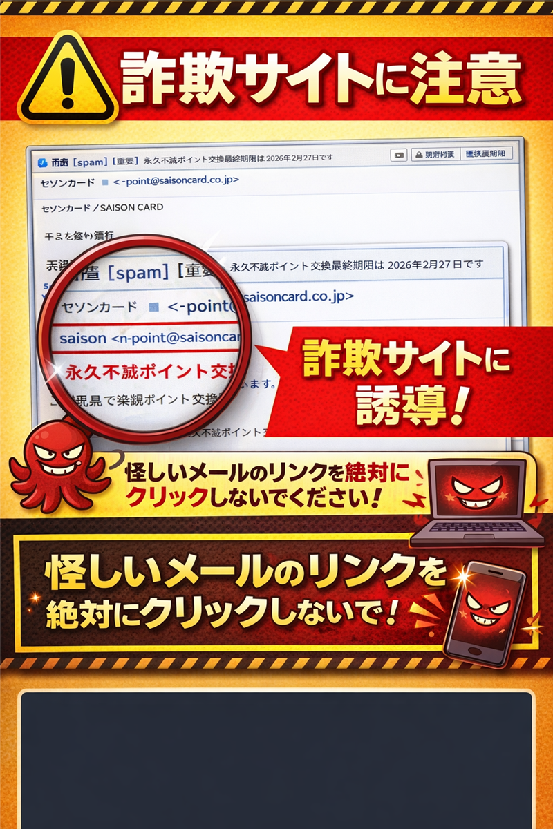 | メールの解析結果 | 件名 | [spam] 【重要】永久不滅ポイント交換最終案内(2月27日まで) No.3597083 | | 判定理由 | 件名に[spam]とあるのは、送信元サーバーの信頼性が低く、サーバー側で自動的に迷惑メールの警告が付与されたためです。 | | 送信者 | “セゾンカード” <point@saisoncard.co.jp> ←盗用偽装 | | 受信日時 | 2026-02-27 12:14 | | メール本文(再現) ※できる限り忠実に再現していますが、本物の詐欺メールとデザインが異なる場合もあります。 セゾンカード/SAISON CARD カード会員各位 平素よりセゾンカードをご利用いただき、誠にありがとうございます。 永久不滅ポイント 交換キャンペーン この機会に永久不滅ポイントを交換すると ログインするだけで 500ポイント プレゼント お客様の現在の永久不滅ポイント残高 26,380 ポイント 永久不滅ポイントで交換できる人気商品 Amazonギフト券 / JCBギフトカード 等 (無効化済:https://sfs***.top/jp/) 最終期限のお知らせ 2026年2月27日(金)23:59 までに交換手続きを完了してください。 本通知は永久不滅ポイントをお持ちのセゾンカード会員様に送付しております。 セゾンカード カスタマーセンター / オンライン:https://www.saisonc***.co.jp/ | | | メールの目的及び感想 【犯人の目的】 受信者の「ポイント残高が具体的に多い(26,380pt)」と誤認させ、ログイン情報を入力させることでクレジットカード情報(NetアンサーのID・パスワード等)を盗み出すことが唯一の目的です。 【専門的な解説】 このメールは背景が白く、末尾が水色のレイアウトを採用していますが、これは昨今の詐欺メールで最も多用されているテンプレートです。公式サイトで注意喚起されている内容と一致しており、特に「ログインだけで500pt付与」といった過剰な好条件は詐欺の決定的な証拠です。 ≫ セゾンカード公式サイトによる注意喚起はこちら