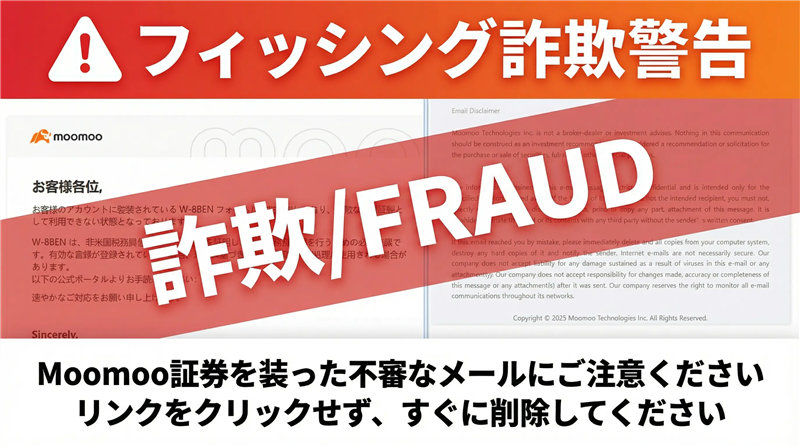 ■ メールの目的および専門的な解説 【犯人の目的】 このメールの目的は、証券口座の「ログイン情報(ID・パスワード)」を盗み取ることです。さらにW-8BENの更新という名目で、マイナンバーや住所などの「個人情報」もセットで搾取しようとしています。 【デザインと不自然な点】 ロゴやフッターの免責事項(Disclaimer)を盗用し、本物っぽく仕上げていますが、宛名が「お客様各位,」となっており、金融機関としては極めて不自然です。また、日本国内向けの案内でありながら末尾が「Sincerely,」と英語になっている点も、海外の犯罪組織によるテンプレート流用の可能性を強く示唆しています。 【怪しい点と公式サイトの対応】 送信者アドレスが公式ドメイン(moomoo.com)でない点が最大の特徴です。moomoo証券の公式サイトでは、このような不審なメールや偽サイトへの注意喚起が常に行われています。 ⇒ moomoo証券公式の注意喚起ページを確認する |