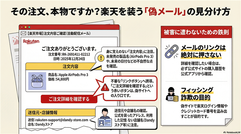 危険なポイントと対処法 * 送信元を比較: 本来の楽天メールは `order@mail.rakuten.co.jp` 等から届きます。今回のドメインは完全に偽物です。 * 宛名の確認: 「お客様、」という記載は不自然です。正規の注文確認には必ず登録者のフルネームが入ります。 * 公式サイトでの確認: 不安な場合はメールのリンクを踏まず、検索から公式サイトへ行き「購入履歴」を直接確認してください。