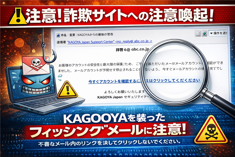 【調査報告】最新の詐欺メール解析レポート メールの解析結果:KAGOYAを騙るフィッシング詐欺 | | ■ 最近のスパム動向 | 今回ご紹介するのは「KAGOYA」を騙るメールですが、その前に最近のスパムの動向について解説します。2026年現在、確定申告や新生活の準備時期を狙い、ホスティングサービスやインフラ事業者を装った「アカウント停止」を予告する脅威が急増しています。特にAWS等のクラウドサービスを踏み台にし、正規のIP帯域から送信することで検知を回避する手法が主流となっています。 | | ■ 受信メール基本データ | | 件名 | [spam] 重要:KAGOYAからの最後の警告 | | 件名の見出し | 件名に「[spam]」が含まれているのは、サーバーの学習機能により迷惑メールの統計パターンに一致したことを示しています。 | | 送信者 | “KAGOYA Japan Support Center” <no_reply@ abc.co.jp> | | 送信者分析 | 送信者アドレスが受信者自身のドメイン(abc.co.jp)となっており、受信者のメールアドレスを盗用してなりすましています。 | | 受信日時 | 2026-02-27 12:42 | | ■ メール本文の再現(解析用データ) | ※できる限り忠実に再現していますが、本物の詐欺メールとデザインが異なる場合もあります。 | 拝啓 6@ abc.co.jp お客様のアカウントの安全性と最大限の保護のため、ご依頼いただいたメールアカウントの確認ができませんでした。メールアカウントが予期せず停止されることのないよう、今すぐメールアカウントの確認を完了してください。 今すぐアカウントを確認するにはクリックしてください よろしくお願いいたします KAGOYA Japan セキュリティチーム Copyright © 2026 KAGOYA Japan, K.K. Inc. All rights reserved. | | | ■ 専門的解析と犯人の目的 | 【犯人の目的】 このメールの目的は、カゴヤのウェブメールサービス「Active!mail」のログイン情報を盗み出すことです。盗んだアカウントは、さらなるスパム送信の踏み台や、社内情報の窃取に悪用されます。 【メールデザインの怪しい点】 本文が短く、具体的な理由がないまま「停止」を予告して不安を煽っています。また、宛名がメールアドレスのローカルパート(6@)のみとなっており、顧客氏名を把握していないことが明らかです。全体的にあっさりして素っ気ない、偽物特有の不自然さがあります。 | | ■ Received:送信元回線解析 | | 解析ホスト | EC2AMAZ-D9RTVDA (ec2-52-199-228-42.ap-northeast-1.compute.amazonaws.com) | | 送信元IP | 52.199.228.42 (信頼できる送信者情報より抽出) | | ホスティング | Amazon Data Services Japan (AWS EC2) | | 設置国 | 日本 (Japan) | | ドメイン分析 | 送信者ドメイン「sansetubi.jp」と送信元IPの逆引きホストが一致しません。AWSの動的IPを悪用した偽装送信です。 | | 詳細解析 | https://ip-sc.net/ja/r/52.199.228.42 | | ■ リンク先ドメイン・サイト解析 | | 誘導URL | hxxps://au-activemail-kagoya-jp.com/imail/login.html#6@acb.co.jp (一部伏せ字を含みます) | | リンク先IP | 103.204.170.155 | | ホスティング | Netmagic Solutions (NTT Global Data Centers) | | 設置国 | インド (India) | | ドメイン登録日 | 2026-02-25 (ドメイン取得からわずか2日。攻撃専用に用意された使い捨てドメインと判断できます。) | | サイト状態 | 稼働中 (ウイルスバスター等のブロックをすり抜ける新設URLのため非常に危険です) | | 詳細解析 | https://ip-sc.net/ja/r/103.204.170.155 | | ■ 潜入調査:リンク先詐欺サイトの画像 | | 【偽のActive!mailログインページ】  本物のカゴヤのログイン画面を完全にコピーしていますが、URLが公式サイトとは一切無関係です。 | | ■ まとめ・推奨される対応 | 【危険なポイントと注意点】 過去の事例と比較しても、カゴヤのドメイン(kagoya-jp.comなど)を巧妙に含めた新設ドメインを使用しており、一見しただけでは偽物と気づきにくい作りになっています。しかし、送信元がAWSであること、リンク先がインドのサーバーであることなど、公式サイトではあり得ない構造が明確です。 【推奨対処法】 - メール内のリンクは絶対に開かないでください。