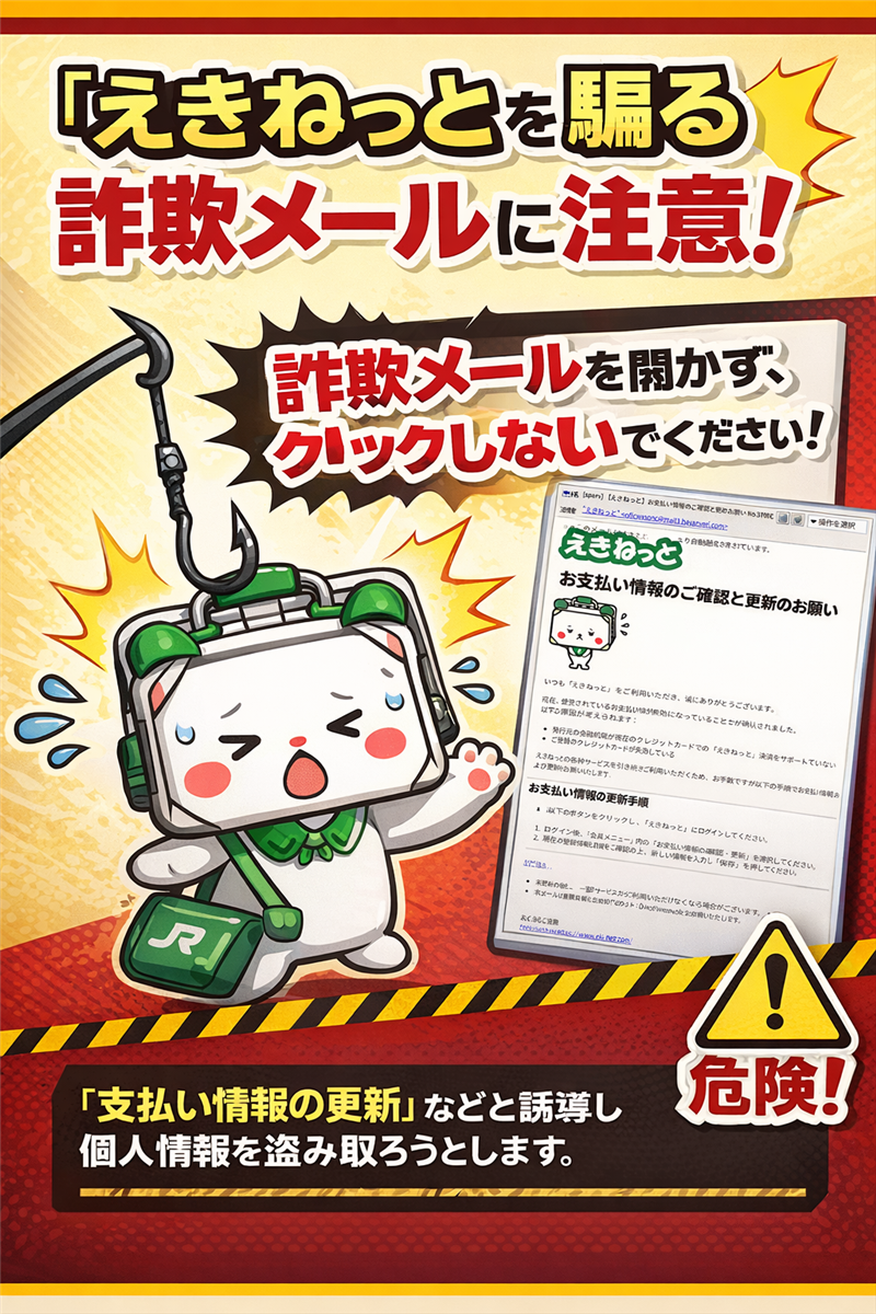 【調査報告】最新の詐欺メール解析レポート メールの解析結果:インフラ機能を悪用した高度なフィッシング手法の特定 | ■ 最近のスパム動向 今回ご紹介するのは「えきねっと」を騙るメールですが、その前に最近のスパムの動向を解説します。現在、2026年春の行楽シーズンを控え、新幹線予約やポイント還元を餌にした詐欺が激増しています。特に「お支払い情報の不備」を理由に24時間以内の更新を迫る「緊急性」を演出する手法が主流となっており、視覚的に判別が困難な公式ロゴの盗用が常態化しています。 | ■ メール解析結果(基本情報) | 件名 | [spam] 【えきねっと】お支払い情報のご確認と更新のお願い No.3708935000 | | 件名の見出し | 「[spam]」という文字列が先頭にある場合、受信サーバー側で「送信ドメイン認証の失敗」や「既知のスパムパターン」を検出し、自動的にフラグを立てていることを示します。 | | 送信者 | “えきねっと” <odlcwxsqnc@mail3.bayanyeri.com> | | 受信日時 | 2026-02-28 0:55 | | 送信者に関する情報 | 表示名は「えきねっと」ですが、実際のアドレスは公式ドメイン(eki-net.com)ではなく、無関係な海外ドメイン(bayanyeri.com)が使用されています。なお、もし送信者が受信者自身のアドレス(aaa@bbb.co.jp等)になっている場合は、メールアドレスを盗用した「なりすまし」の手法です。 | ■ メール本文の再現 ※できる限り忠実に再現していますが、本物の詐欺メールとデザインが異なる場合もあります。 ※このメールはえきねっとより自動配信されています。  お支払い情報のご確認と更新のお願い  いつも「えきねっと」をご利用いただき、誠にありがとうございます。 現在、登録されているお支払い情報が無効になっていることが確認されました。 以下の原因が考えられます: - 発行元の金融機関が現在のクレジットカードでの「えきねっと」決済をサポートしていない