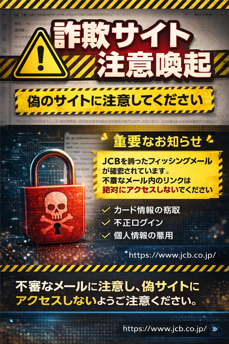 | 詐欺サイトの現状確認 【停止確認済み:詐欺サイトへのアクセス遮断画面】  | | まとめと推奨される対処法 過去のJCB詐欺事例と比較しても、公式サイトの警告文を逆手に取るなど、手口の巧妙化が際立っています。 危険なポイント: * 送信者アドレスが公式を装っているが、通信ヘッダー(Received)が海外サーバー経由である。 * 誘導先のドメインが「jcb.co.jp」ではなく、不審な「.cfd」ドメインである。 対処法: 不審なメールを受け取ったら、本文内のリンクは絶対にクリックせず、ブラウザのブックマークや公式アプリから直接MyJCBへアクセスしてください。 【重要】JCB公式サイトの注意喚起情報を確認する
